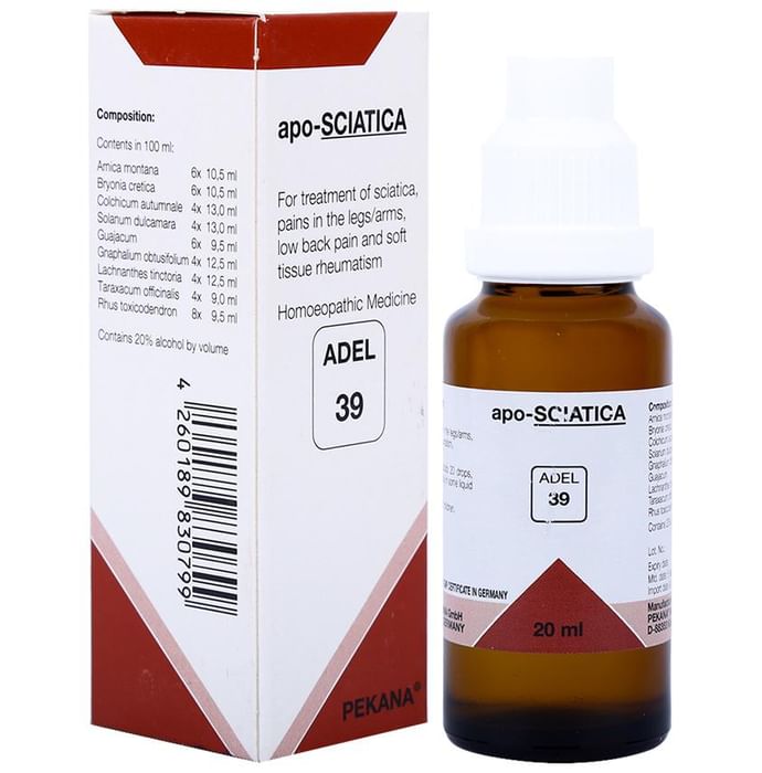 ADEL 39 Apo-Sciatica Drop helps in relieving the pain of sciatica, low back pain, pain in the legs/arms and treatment of soft tissue rheumatism. It helps in balancing the blood pressure and categories inflamed regions and stagnations in it. But also it helps for beginning and up working rheumatism in different parts of the body. | Key Ingredients: Arnica montana 6X Bryonia cretica 6X Colchicum autumnale 4X Gnaphalium obtusifolium 4X Guajacum 6X Lachnanthes tinctoria 4X Solanum dulcamara 4X Taraxacum officinale 4X Rhus toxicodendron 8X | Key Benefits: It is a reliable remedy for angina pectoris, neurocirculatory dystonic states, hypertonia, colon cramps and spastic situations and is produced by urinary stones It is a well-known remedy against convulsions, cramps of all muscles of the body, special groups of muscles, calf cramps, colics and collapses It regulates excitements of the brain compounded with sleeplessness, colic states in the abdomen and other spasms, in a reliable manner Its indications a very good treatment for coronary spasms, angina pectoris, sclerotic processes and readiness for collapses in combination with mind disturbances It is a very useful matter, as it is an omnipotent spasmolytic one for gastritis, ulcers ventriculi and duodeni cramps and colitis states | Directions For Use: Read the label carefully before use. | Safety Information: Read the label carefully before use Store in a cool and dry place away from direct sunlight Keep out of reach of children