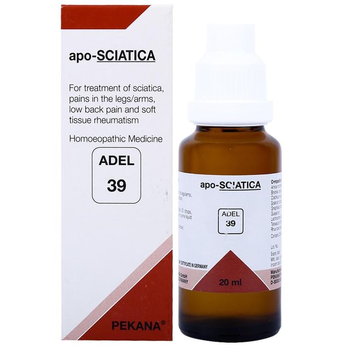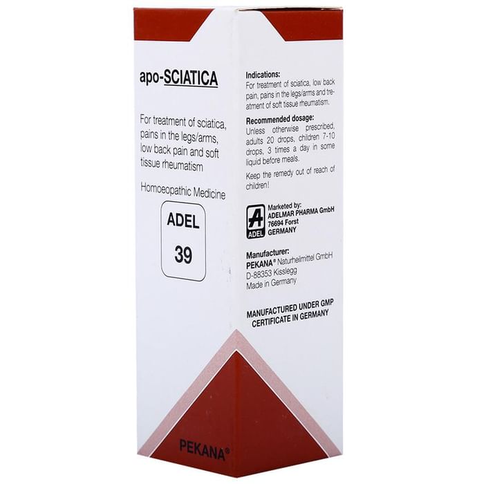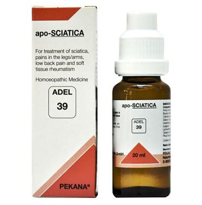 ADEL 39 Apo-Sciatica Drop ADEL 39 Apo-Sciatica Drop helps in relieving the pain of sciatica, low back pain, pain in the legs/arms and treatment of soft tissue rheumatism. It helps in balancing the blood pressure and categories inflamed regions and stagnations in it. But also it helps for beginning and up working rheumatism in different parts of the body.