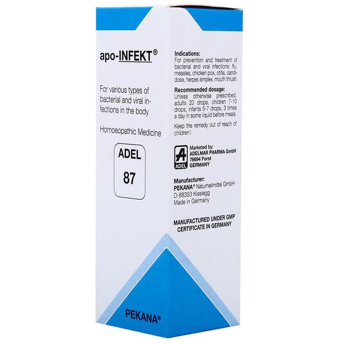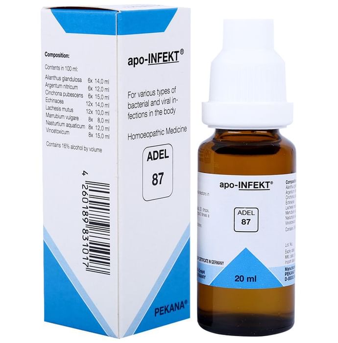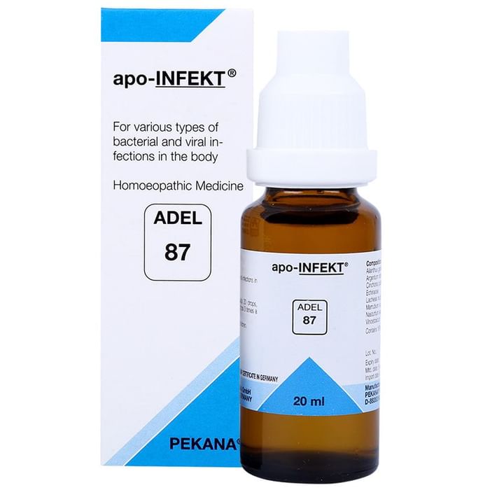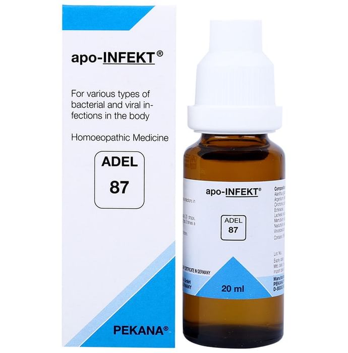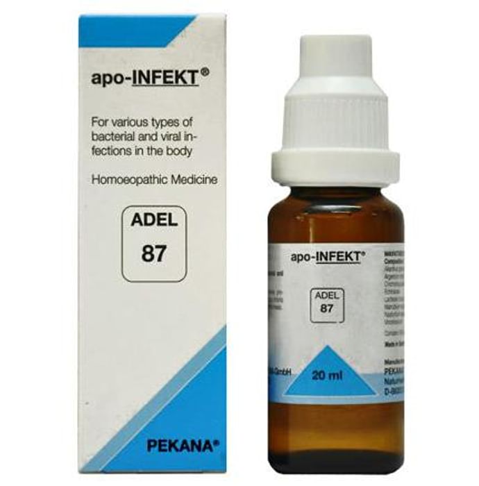 ADEL 87 Apo-Infekt Drop ADEL 87 Apo-Infekt Drop It is an effective anti-viral medicine. It is capable of aiding various diseases caused by viruses through a blend of homoeopathic herbs. It is helpful with chronic fever, and digestive disorders and could be used to boost immunity and helps your body fight various bacterial infections and recurring diseases.