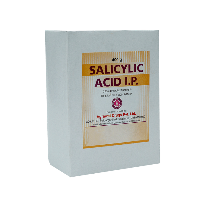 ADPL Salicylic Acid I.P. Powder is used for skin care. It is a chemical exfoliator that removes obstructions deep within the skin pores. It possesses anti-inflammatory qualities that aid in managing acne-related oedema and redness. It aids in the removal of warts, calluses, and blemishes on the skin. Salicylic acid is widely used as an acne fighter. It removes excess oil from the skin by breaking down its natural oils. Mix it with coconut oil or white petroleum jelly and apply it to the affected area. | Key Ingredients: Salicylic acid. | Key Benefits: It helps in managing acne and psoriasis Reduces redness and blockage in skin It prevents blackheads and whiteheads The powder helps in preventing skin blemishes | Directions For Use: Mix it with coconut oil or white petroleum jelly and apply it to the affected area. | Safety Information: Read the label carefully before use Store in a cool and dry place, away from sunlight Keep out of reach of children Not for children under aged 15