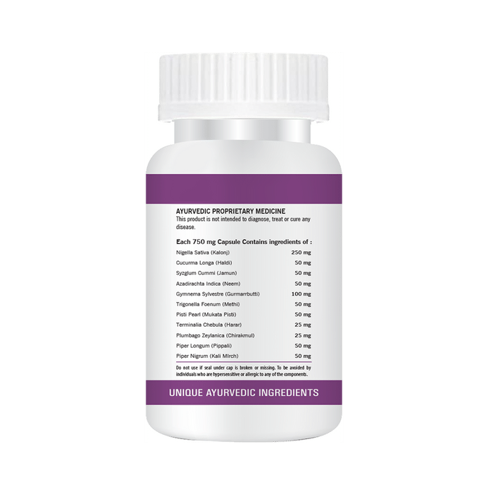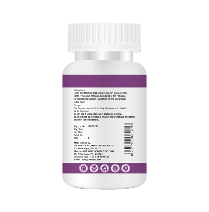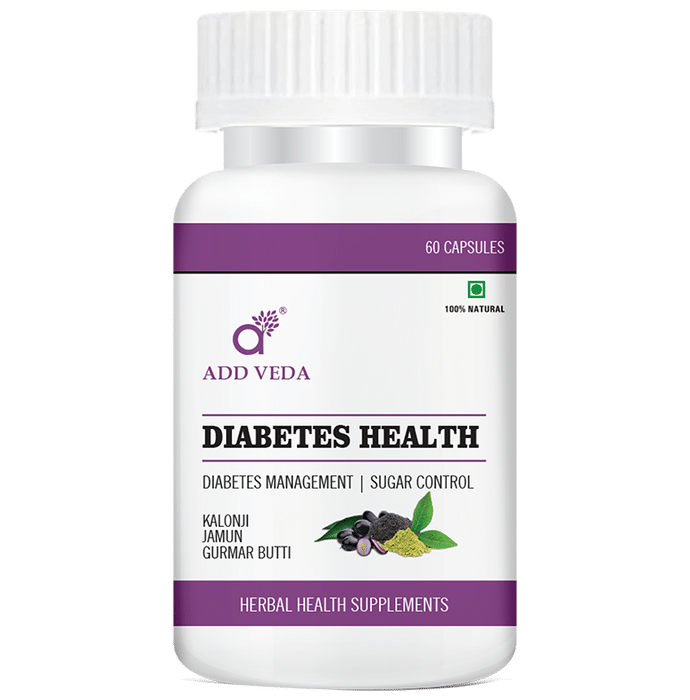 Add Veda Diabetes Health Capsule Diabetes Health Capsule contains Shatavar (Asparagus), Ashwagandha (Winter Cherry), Amla (Emblica Officinalis), Harar (Terminalia Chebula), Kali Musli (Black Musale), Bhangra (Mistletoe), Shilajit (Mineral Pitch), Chitrakmul (Ceylon Leadwort), Pippali (Dried Catkins), Mukta Pisti (Pisti Pearl), Loh Bhasma (Iron), Methi (Trigonella Foenump), Gudmar Buti (Gymnema Sylvestre), Karela (Momordia Charanth), Jamun (Syzglum Cummi), Neem Patra (Azadirachta Indica), and Tribhang Bhasam (Bhasam of 3 Mineral).