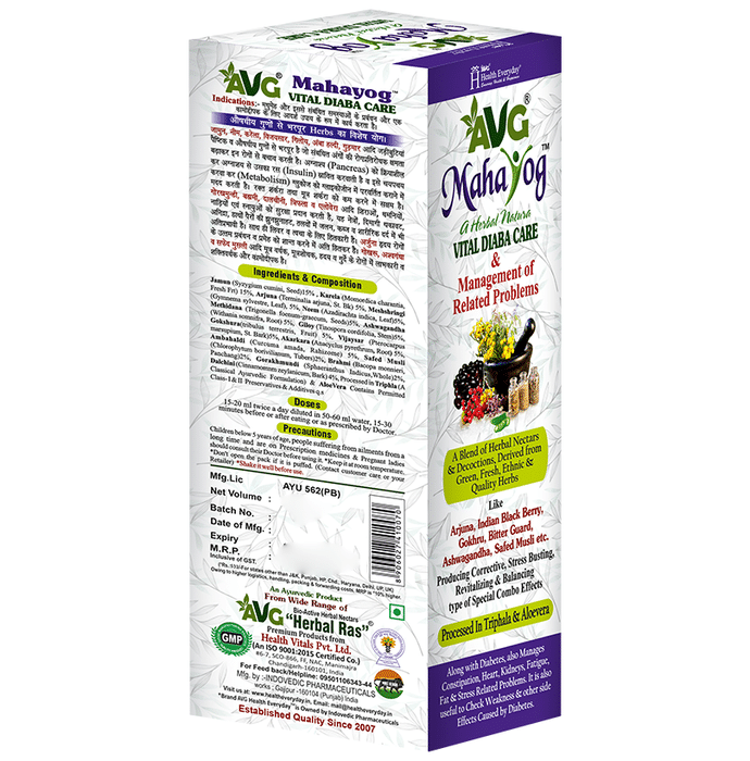 Avg Mahayog Diabetes Care Plus uses a unique blend of highly specialized herbs which are highly effective in treating diabetes and its related disorders. It combines the goodness of cinnamon, blackberry, safed musli, Ashwagandha, Arjuna, Brahmi and Bitter Gourd to cure ailments caused by diabetes. | Key Ingredients: Cinnamon Blackberry Safed Musli Ashwagandha Arjuna Brahmi Bitter Gourd | Key Benefits: Primarily used for the treatment of diabetes and its related disorders It treats multiple health complications and can be used to treat and prevent diseases affecting the vital functions of the body and can also be used to manage obesity Helps reduce bad cholesterol levels and can be effectively used to treat low libido caused due to diabetes, heart weakness, constipation and various neuropathies It can be used to reduce glucose levels and prevents it from risinging Combines the goodness of ashwagandha and musli which are loaded with antioxidants. It treats weakness caused by diabetes and boost vitality and performance | Directions for use: Take Avg Mahayog Diabetes Care Plus as directed by the physician. | Safety Information: Read the label carefully before use Do not exceed the recommended dose Keep out of the reach of children Store in a cool dry place away from direct sunlight and heat