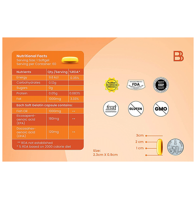 BBetter Omega 3 Fish Oil 1000mg Softgel is a trusted Omega 3 supplement for women and men. The Omega 3 fatty acid capsules are manufactured at an FDA registered and inspected facility. Furthermore, your BBetter Omega 3 Fish Oil Supplements are purified to remove mercury. The effective EPA: DHA ratio in the BBetter Omega 3 Fish Oil has been scientifically studied to be more effective than the regular 1:1 ratio. BBetter Omega 3 Fish Oil helps you have a healthy heart and brain, glowing skin and stronger muscles. | Key Ingredients: Omega 3 Fatty Acids 1000mg | Key Benefits: OMEGA 3 FATTY ACID FOR YOUR SKIN AND HAIR: Studies suggest that Omega 3 fish oil help nourish skin, fight acne and boost hair growth OMEGA 3 FISH OIL SUPPLEMENT FOR YOUR MUSCLES: By improving the MPS and protein synthesis, Omega 3 aids in improving muscle strength and muscle recovery NO MERCURY: BBetter Omega 3 Fish Oil is manufactured at FDA registered and inspected facility and has been purified to remove mercury EFFECTIVE EPA: DHA RATIO: BBetter Omega 3 Fish Oil has an effective EPA: DHA ratio that has been scientifically studied to mitigate inflammatory risk factors compared to a 1:1 ratio NO FISH BURPS: BBetter Omega 3 Fish Oil have provided an effective solution to customers who face trouble with the fish burps while taking the Omega 3 Supplement | Directions For Use: Take 2 soft gels daily, during or immediately after a meal or as directed by a healthcare professional. | Safety Information: Read the label carefully before use Store in a cool and dry place away from direct sunlight Keep out of reach of the children