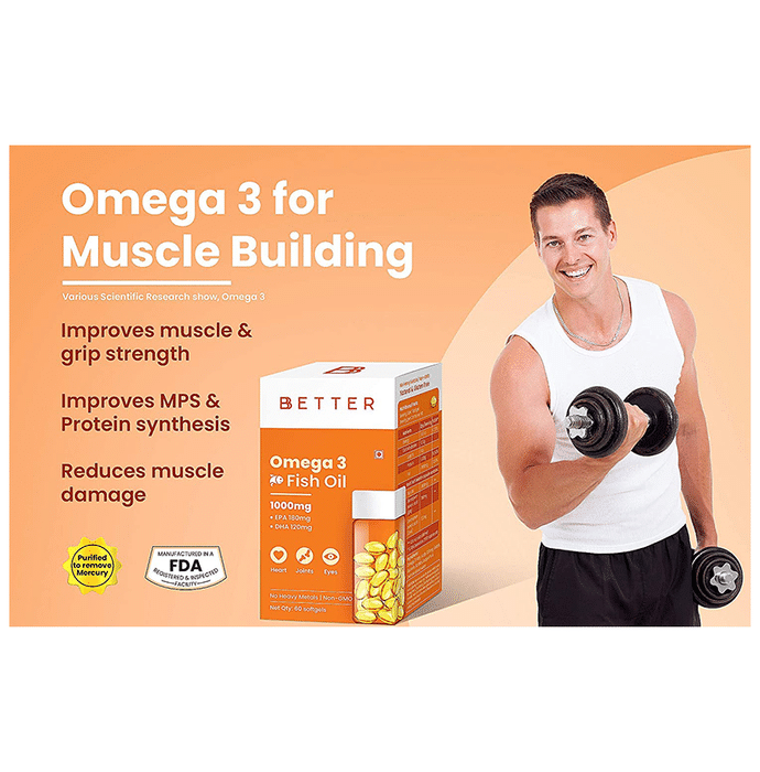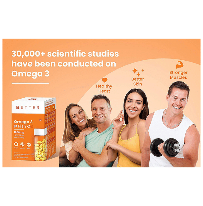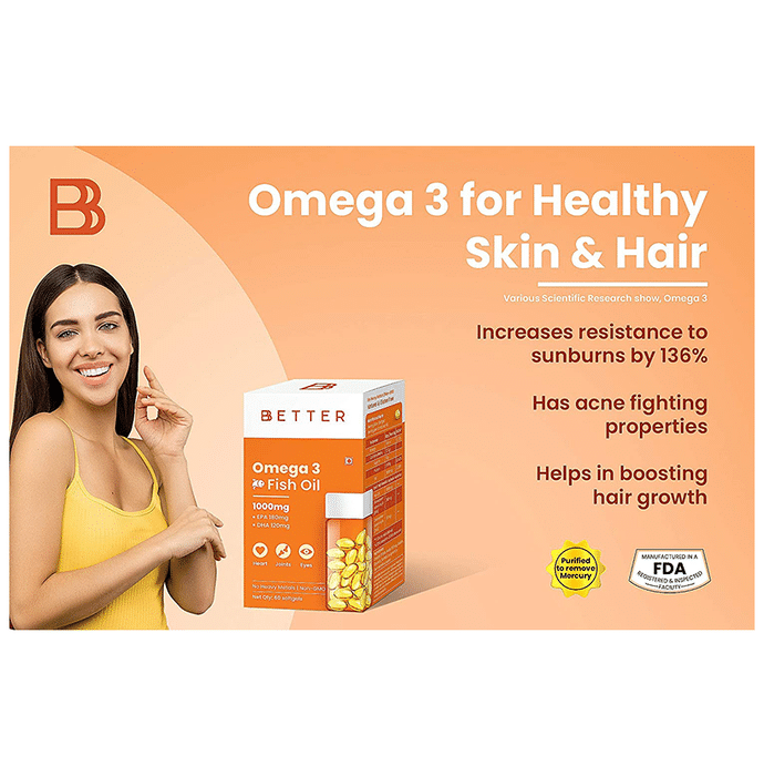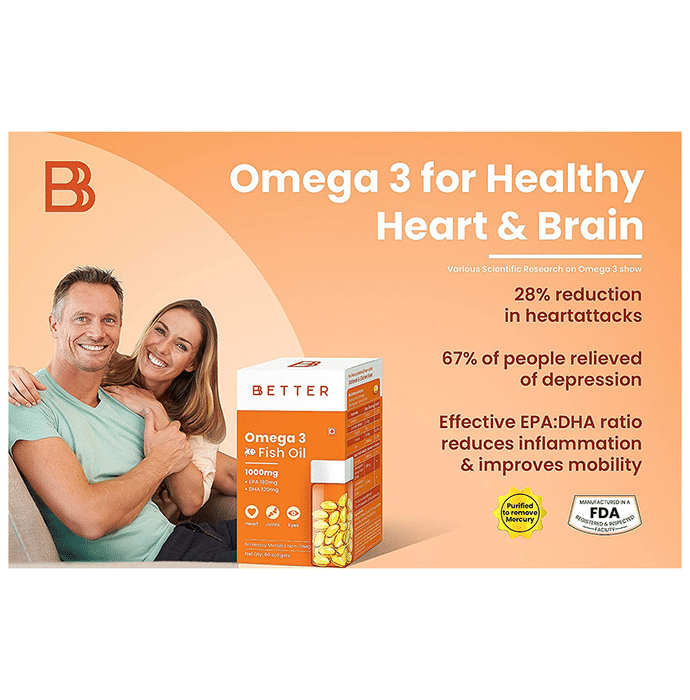 BBetter Omega 3 Fish Oil 1000mg Softgel BBetter Omega 3 Fish Oil 1000mg Softgel is a trusted Omega 3 supplement for women and men. The Omega 3 fatty acid capsules are manufactured at an FDA registered and inspected facility. Furthermore, your BBetter Omega 3 Fish Oil Supplements are purified to remove mercury. The effective EPA: DHA ratio in the BBetter Omega 3 Fish Oil has been scientifically studied to be more effective than the regular 1:1 ratio. BBetter Omega 3 Fish Oil helps you have a healthy heart and brain, glowing skin and stronger muscles.