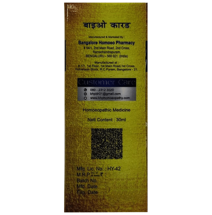 BHP Bio-Card Cardiac Tonic is a perfectly formulated bio-card cardiac tonic that can be useful in cardiac palpitation, hypertension, cardiac unrest, palpitation pains, sleeplessness, shortness of breath, heart murmur, etc. It helps regulate and maintain healthy heart function and strengthens the cardiovascular system as well. | Key Ingredients: Crataegus Oxy 1x Cactus Grandi 2x Strophanthus 3x Convallaria Maj 3x Aurum Mur Nat 6 Terminalia Arjuna 1x Adonis Ver 3x | Key Benefits: Bio-card cardiac tonic tones up the cardiovascular system It is useful in cardiac dyspnea, hypertension, cardiac weakness, etc This tonic also regulates the functioning of heart without any side effect | Directions For Use: Take 10-15 BHP bio-card cardiac drops with little water three times a day before meals or as advised by the physician. | Safety Information: Read the label carefully before use Do not exceed the recommended dosage Store in a cool and dry place away from direct sunlight Keep it away from the reach of children