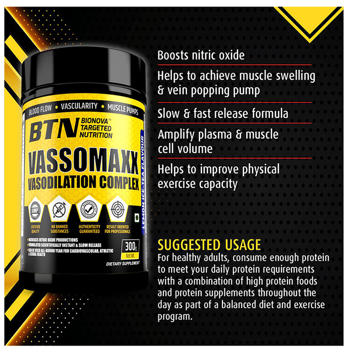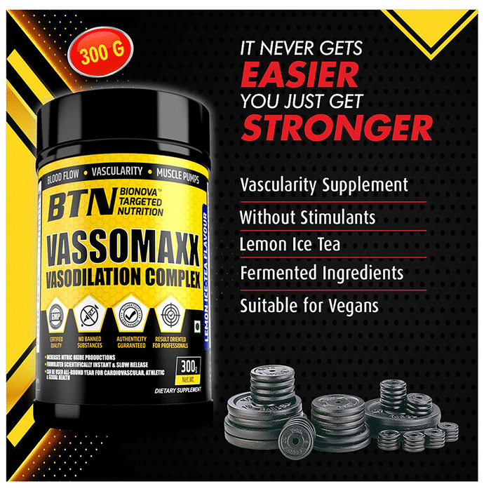 BTN Vassomaxx Vasodilation Complex Powder Lemon Ice Tea Bionova Targeted Nutrition Vassomaxx Vasodilation Complex helps in promoting nitric oxide production, which is not produced by the body in sufficient amounts. Nitric oxide widens the nerve vessels to deliver oxygen-rich blood to the muscle tissues.