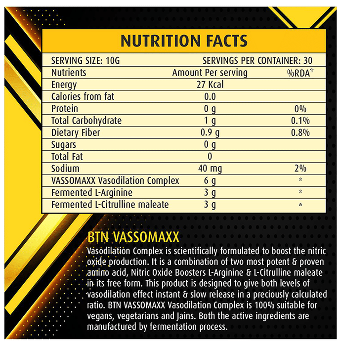 Bionova Targeted Nutrition Vassomaxx Vasodilation Complex helps in promoting nitric oxide production, which is not produced by the body in sufficient amounts. Nitric oxide widens the nerve vessels to deliver oxygen-rich blood to the muscle tissues. | Key Ingredients: Vasodilation complex (L-Arginine and L-Citrulline) Dextrose Monohydrate Acidity regulator(296) Sweetener (955) | Key Benefits: It improves physical endurance It is a vasodilator, meaning it relaxes the inner muscles of your blood vessels, thereby causing them to widen. Nitric oxide increases blood flow to the muscles Nitric oxide supplements increase endurance during high-intensity exercises It improves blood flow in the body It helps reduce fatigue while performing strenuous activities It helps in boosting athletic performance It is a vegetarian product | Directions For Use: Use as directed by the physician. | Safety Information: Read the label carefully Store in a cool and dry place Keep out of the reach of children