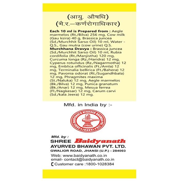 Baidyanath (Jhansi) Bilva Tail is a herbal oil that can be used in dealing with ear problems like wax removal and tinnitus. This oil is also used as a part of the procedure called karna poorana. Bael is the main ingredient of this product. This medicine is most commonly used in North Indian Ayurveda practice. | Key Ingredients: Bilva Gomutra Aja ksheera Til tail | Key Benefits: This product can be used to remove wax from the ear canals It can be used to reduce ear pain, hearing difficulties and tinnitus This oil can be effective in dealing with deafness | Directions For Use: Use as directed on the label or as advised by your healthcare provider | Safety Information: Read the label carefully before use Do not exceed the recommended dosage Store in a cool and dry place away from direct sunlight Keep out of reach of children