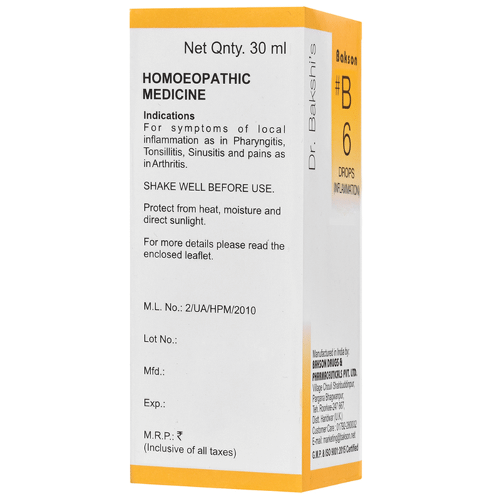 Bakson's Bakson B6 Inflammation Drop Bakson’s B6 Inflammation Drops is an effective remedy for treatment of inflammation. Inflammation is a condition in which the body’s white blood cells and substances produced by them to fight off harmful substances. It helps in reducing inflammation in the part of the body that is affected by it and reduces redness and swelling.