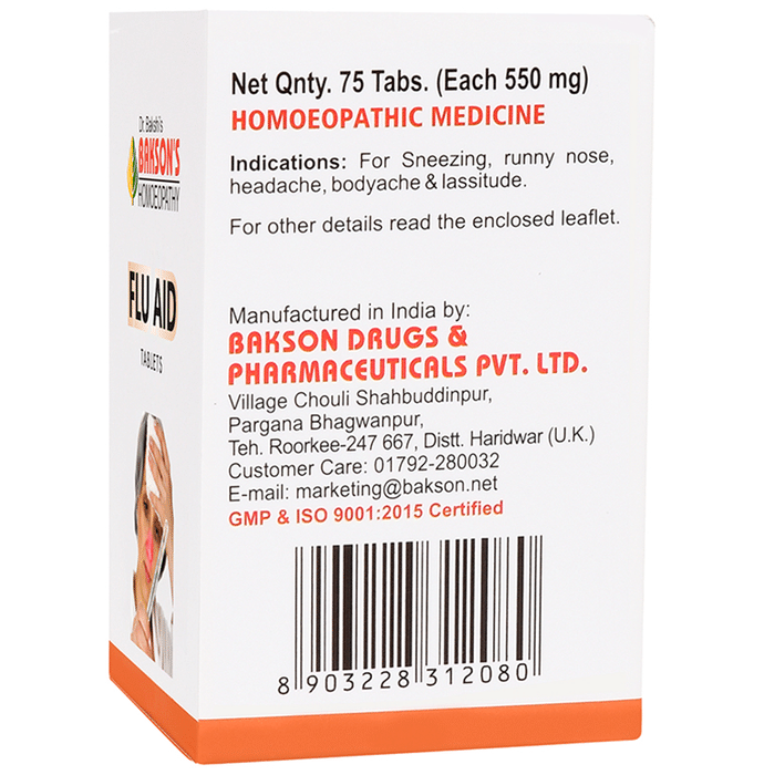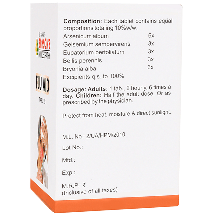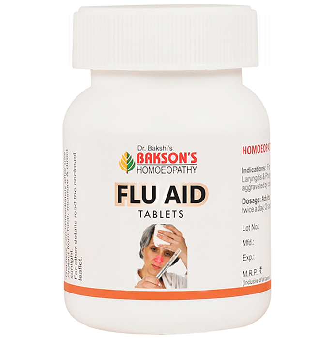 Bakson's Flu Aid Tablet FLU AID TABLETS For Influenza (Flu) INDICATIONS Aids an instant and effective recovery from attacks of Coryza. To overcome an acute attack of flu, sneezing, runny nose, low to high grade fever, chilliness, headache, pain in bones and muscles, cough and general weakness. Recommended in following Disease: Difficulty in breathing (shortness of breath, breathlessness or dyspnea, wheezing, apnea, heart diseases and lung diseases like COPD, Emphysema, chronic bronchitis and lung cancer. Recurrent Cough and Cold. Fever (pyrexia), Influenza, Allergic Rhinitis Composition: Arsenicum album 200, Gelsemium semp. 200, Eupatorium perf. 200, Bellis perennis 200, Bryonia alb. 200. Dosage: Adults: 1 tab 2 hourly, 6 times a day. Children: Half the adult dose. Presentation: 75 tablets Note: Do not self medicate. Please consult your physician for proper diagnosis and prescription. Use under medical supervision.