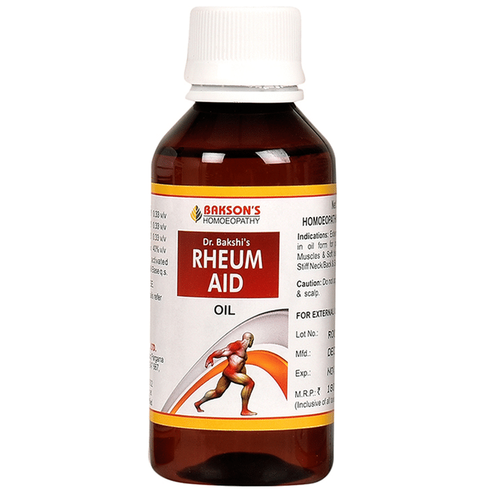 Bakson's Rheum Aid Oil Bakson's Rheum Aid Oil is a non-greasy oil for pain in joints, muscles soft tissues, sprains, stiff neck/back, and sciatica. It is easily absorbed into the skin surface after hot fomentation. It exhilarates the fatigued muscles to improve the flexibility and movement of body parts.