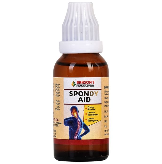 Bakson's Spondy Aid Drop is used to treat stiff joints and swollen sensations. Spongy Aid Drop mainly treats pain and inflammation associated with Cervical and Lumbar Spondylosis. It influences the production and formation of cartilage around the body. | Key Ingredients: Acid form. 3x, Colch. ant. 5x, Rhus tox. 3X, Ledum pal 3x, Dulcamara 3x, Gels. semp. 3x, Ulmus 5x | Indications: It is indicated for the treatment of Arthritis, Cervical Spondylosis, Frozen Shoulder, Lumbar Spondylosis, Osteoarthritis, Rheumatoid Arthritis, Spondyloarthropathy. | Key Benefits: Spondy Aid Drop helps in reducing the pain and inflammation of the affected joints Spondy Aid Drop significantly reduces stiffness and radiating pain associated with Cervical and Lumbar Spondylosis, thereby improving the ability to function normally Spondy Aid Drop also reduces muscle spasms and frequency of pain, thus restoring the general strength of the body | Dosage: Take 10-15 drops of Spondy Aid Drop in half a cup of water thrice a day or as directed by the physician. | Safety Information: Read the label carefully before use Do not exceed the recommended dosage Store in a cool and dry place Keep away from the reach of children