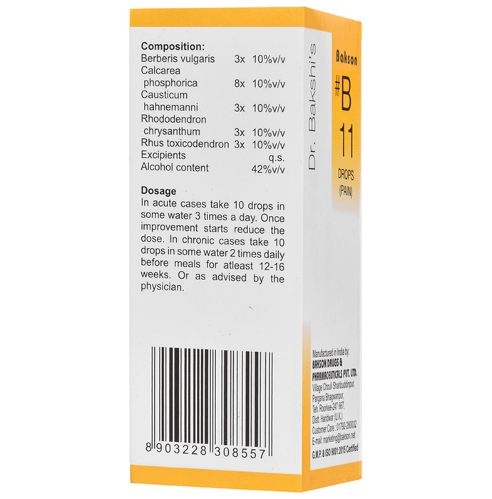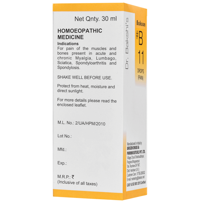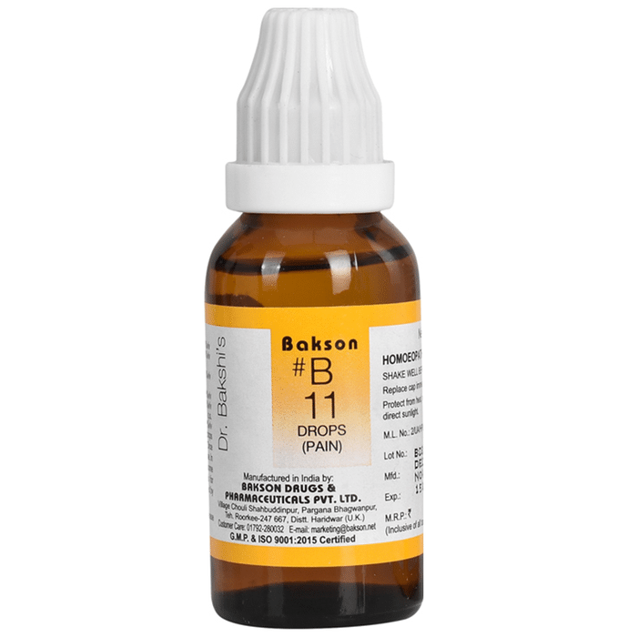 Bakson B11 Pain Drop Bakson B11 Pain Drop is an excellent homeopathic remedy which is used for the treatment of several health complications. It is primarily used for the treatment of rheumatism and arthritis and effectively treats conditions associated with anaemia such as rapid loss of strength and exhaustion.Pain Drops contains diuretic properties and can also be used to treat urinary disorders.