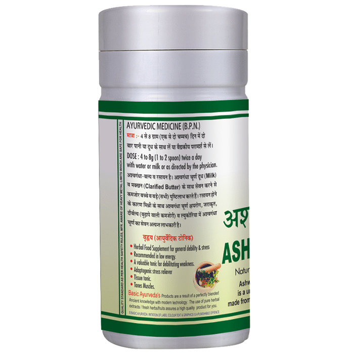 Basic Ayurveda Ashwagandha Churna Basic Ayurveda Ashwagandha Churna contains ashwagandha as its main ingredient. It is known for its multiple benefits. It help to improve memory. It is a natural tonic for overall improvement of the health.