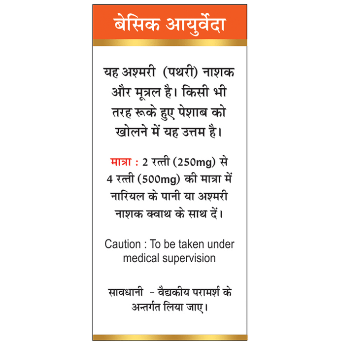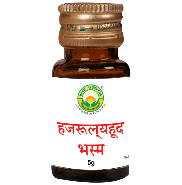 Basic Ayurveda Hajrulayahuda Bhasma is a calcinated zinc ayurvedic herbomineral preparation. In conditions such as urinary retention, it acts as an antilithiatic and promotes better urination. It alleviates ureteral stones, urinary discomfort, and a burning sensation. | Key Ingredients: Hajrulayahuda | Key Benefits: Basic Ayurveda Hajrulayahuda Bhasma is beneficial for maintaining urinary disorders It helps reduce the burning sensation during urination It also helps in preventing the formation of kidney stones and relieves related issues | Directions For Use: Use as directed on the label or as advised by your physician. | Safety Information: Read the label carefully before use Do not exceed the recommended dosage Store in a cool and dry place away from direct sunlight Keep out of reach of children