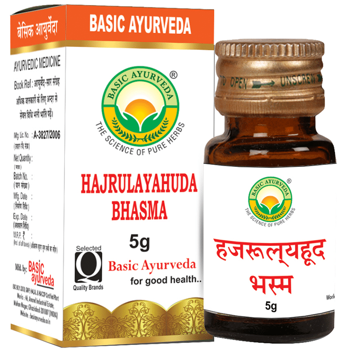 Basic Ayurveda Hajrulayahuda Bhasma Basic Ayurveda Hajrulayahuda Bhasma is a calcinated zinc ayurvedic herbomineral preparation. In conditions such as urinary retention, it acts as an antilithiatic and promotes better urination. It alleviates ureteral stones, urinary discomfort, and a burning sensation.