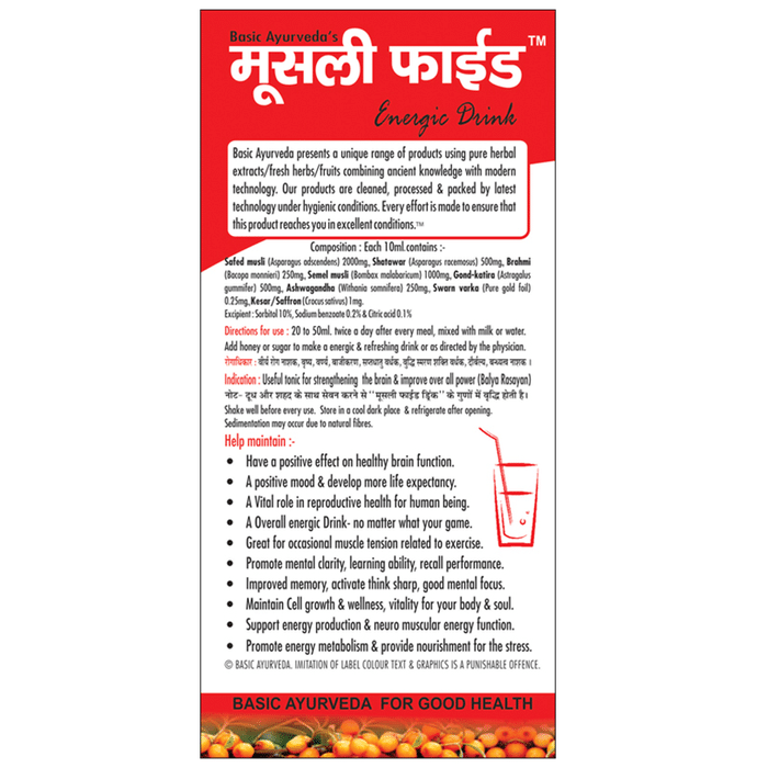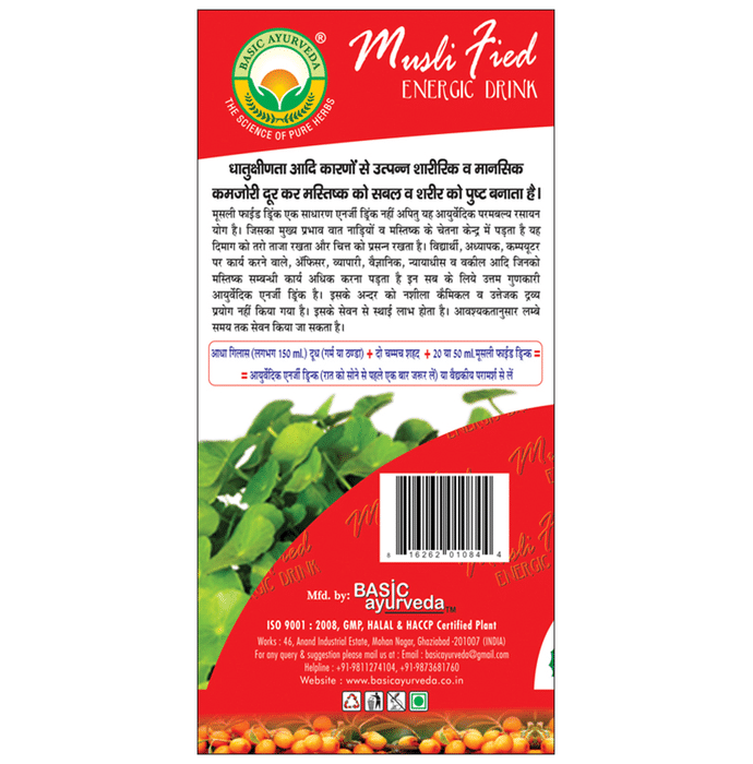 Basic Ayurveda Musli Fied Energy Drink Basic Ayurveda Muslified Energy Drink contains safed musli, shatawa, brahmi, gond katira, ashwagandha, and kesar. It is routine health support for men, women, children & seniors. It is useful tonic for strengthening the brain & improve overall power.