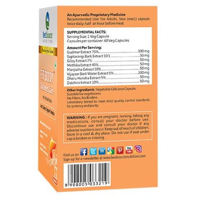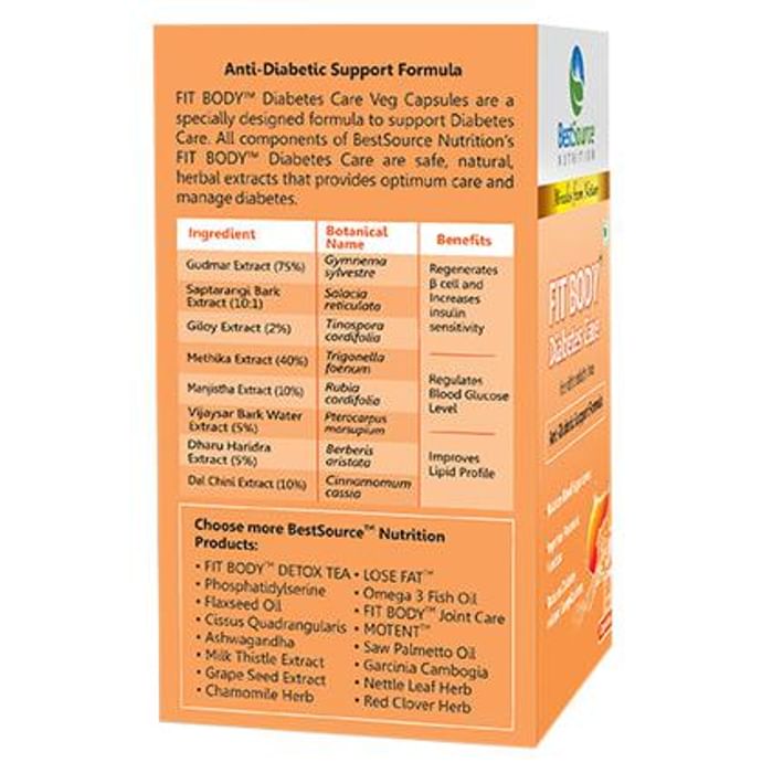 BestSource Nutrition Fit Body Diabetes Care Capsule BestSource NutritionFit Body Diabetes Care Capsule is a specially designed formula to support diabetes care. It has 8 herbal extracts namely Gudmar Extract (Gymnema Sylvestre), Saptarangi Bark Extract, Giloy Extracts, Fenugreek Extract, Manjistha Extract, Vijaysar Bark Water Extract, Turmeric (Haldi, Barberisaristata) and Cinnamon.