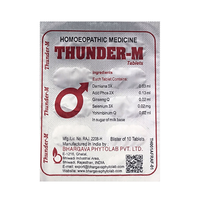 Bhargava Thunder-M Tablet is a nervine tonic made for males to help with senile debility, loss of vigour and vitality and premature ejaculation. It also alleviates the pain related to the inflammation of prostate and seminal vesicle. Thunder-M tablets also aids men in impotency, sexual neurasthania and nervous exhaustion. | Key Ingredients: Damiana 3x Acidum phosphoricum 2x Ginseng panax Q Selenium 3x Yohimbinum Q | Key Benefits: It helps reduce the painful inflammation of prostate and testicles It is beneficial for senile debility, loss of vigour and vitality and premature ejaculation Ginseng is beneficial for impotency and increasing sperm count Yohimbinum helps increase sexual desire and offers a long-lasting erection | Directions For Use: 1 tablet 2 times a day or as advised by the physician. | Safety Information: Read the label carefully before use Do not exceed the recommended dosage Keep out of reach of children