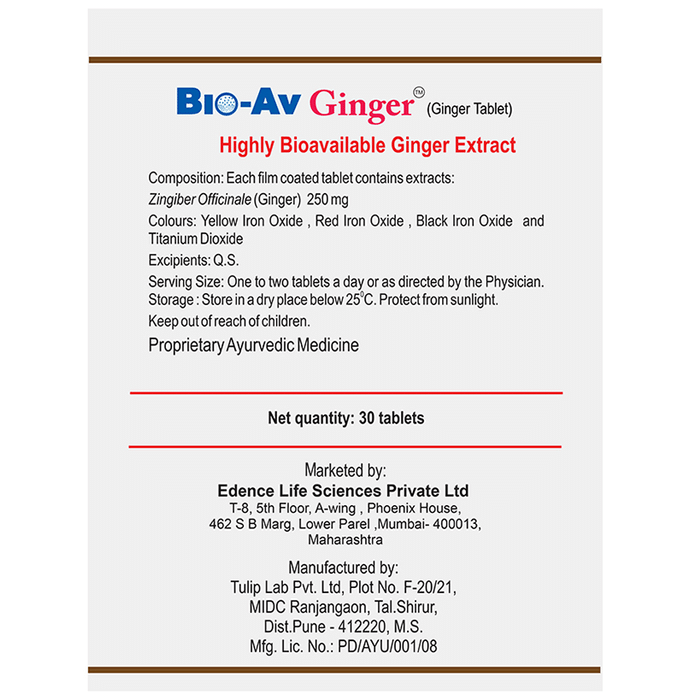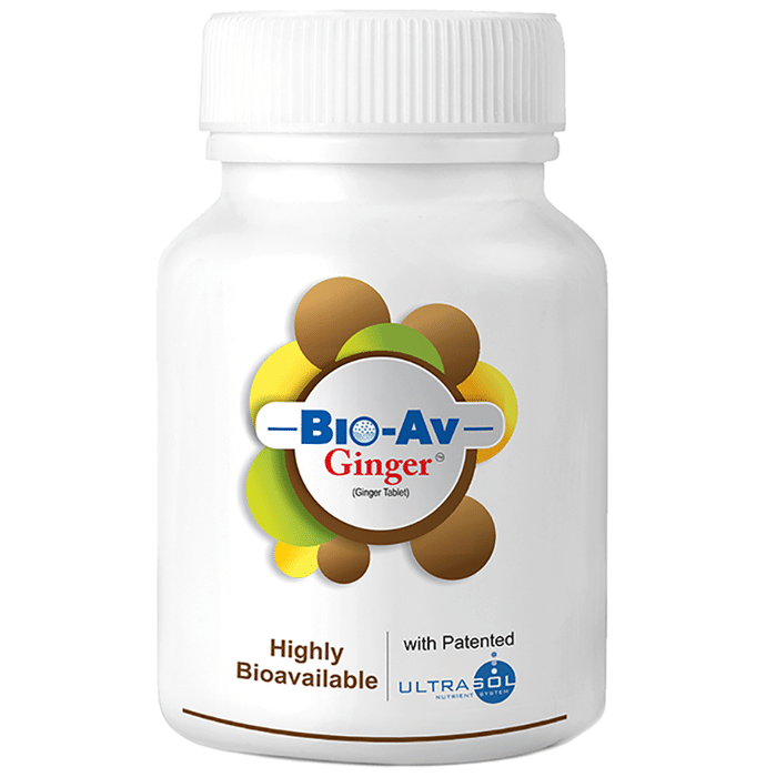 Bio-Av Ginger Tablet is a highly bioavailable ginger, developed using patented Ultrasol Technology which exponentially enhances absorption. The antioxidants protect and facilitate more efficient utilization within the body. The resultant product is far superior to regular forms of Ginger, thus requires less quantity to make a positive impact. | Key Ingredients: Zingiber Officinale (Ginger) | Key Benefits: Bio-Av Ginger helps reduce bloating, flatulence and poor digestion Ginger is known to reduce pain, intensity and frequency of migraine attack Bio-Av Ginger is useful across all types of nausea and vomiting Gingerol, the active ingredient reduces pain and menstrual cramps Reduces the intensity and frequency of cold, flu and allergies Reduces the intensity of muscle soreness and joint pain | Directions For Use One to two tablets a day or as directed by the Physician. | Safety Information: Read the label carefully before use Keep out of reach of the children Use under medical supervision Store in a cool dry place away from direct sunlight