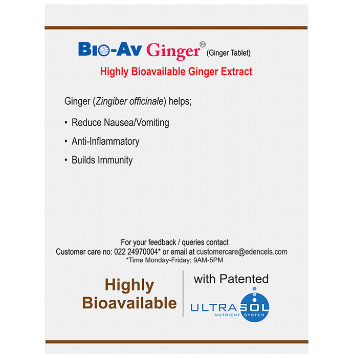 Bio-Av Ginger Tablet Bio-Av Ginger Tablet is a highly bioavailable ginger, developed using patented Ultrasol Technology which exponentially enhances absorption. The antioxidants protect and facilitate more efficient utilization within the body. The resultant product is far superior to regular forms of Ginger, thus requires less quantity to make a positive impact.