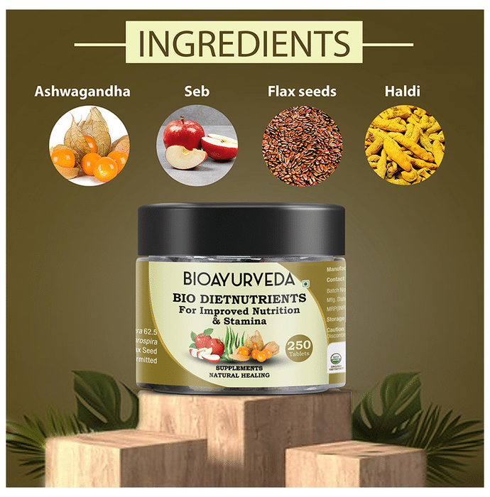 Bioayurveda Bio Dietnutrients Tablet helps you to exercise harder and enhances your workout by releasing clean energy throughout your workout. It helps you improve your physique and help to push yourself to your limits. It is potent in burning fats that help convert stored body fat to fuel by transporting stored fat to the muscle where it can be burned as energy. This helps muscle growth and weight loss and helps you get lean faster. | Key Ingredients: Ashwagandha Seb Flax seeds Haldi | Key Benefits: It helps to provide protection to the cells from free radical damage It boosts recovery post intense workout sessions It benefits energy levels by transporting fatty acids into the mitochondria where they can be burned up and used as fuel It helps convert fat into energy by transferring fat into the mitochondria of cells, especially long-chain fatty acids It has the visible ability to increase mental alertness, promote high energy and make your brain works faster It helps in the reduction of muscle soreness and improves muscle health It also aids in the reduction of muscle damage and helps in faster muscle recovery | Directions For Use: Use as directed on the label or as advised by your healthcare provider. | Safety Information: Read the label carefully before use Store in a cool and dry place away from direct sunlight Keep out of reach of children