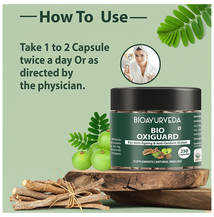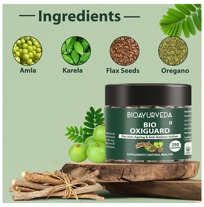 Bioayurveda Bio Oxiguard Capsule is formulated with such rare herbals to help the diabetic patients to maintain their normal health in all walks of life to provide stamina, extra energy and required strength in daily routine work. It contains soluble and insoluble fibre which helps to avoid fatigue and the need for frequent eating in diabetic patients. | Key Ingredients: Amla Karela Flax seeds Oregano | Key Benefits: It protects cells from free radical attack and carries oxygen across the body It slows down the ageing process and helps to strengthen the immune system and regain lost health by improving cellular metabolism with the power of oxygen The nutrition supplement is one such answer to the issues of oxidative stress, compromised immunity status, tumours, cholesterol imbalance and free radicals leading to CVD/ cancer It aims at revitalising the skin by bringing the skin layers balance, boosting the skin’s metabolism, improving the moisture balance of the skin and maintaining the elasticity It ensures the bioavailability of oxygen on a cellular level and energising the organs also supports and promotes a healthy and active lifestyle Oxygen supplement that improves your immunity, boosts your energy levels and enhances skin health- with the help of oxygen | Directions For Use: Use as directed on the label or as advised by your healthcare provider. | Safety Information: Read the label carefully before use Store in a cool and dry place away from direct sunlight Keep out of reach of children