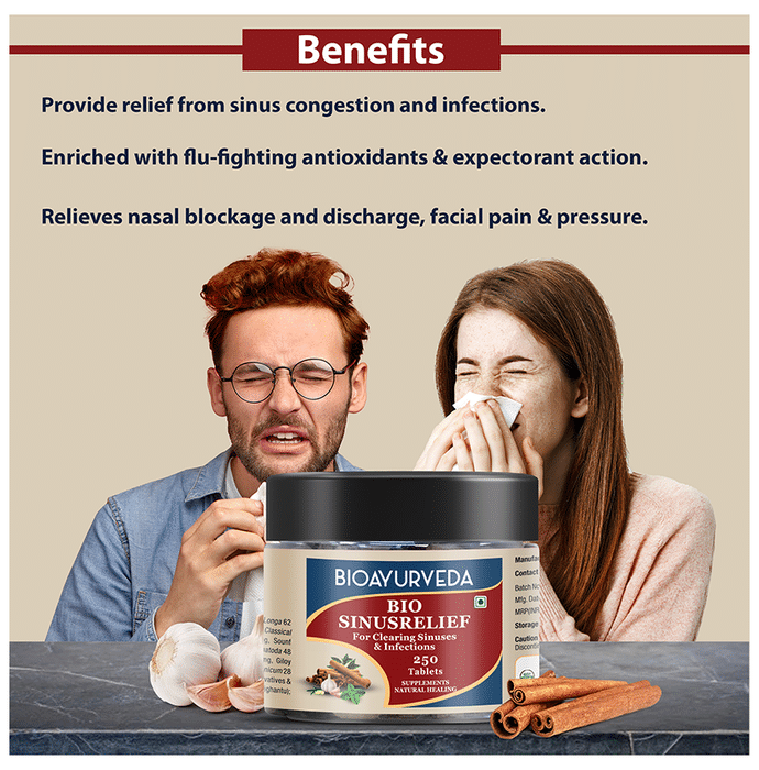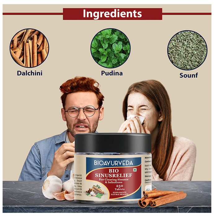 Bioayurveda Bio Sinusrelief Tablet is indicated for instant and complete relief from sinusitis and headache. It relieves your distressing symptoms of the nasal block, post nasal drip and cough. It is formulated to provide relief from the symptoms of cough and cold. It is also helpful in asthma, coughs, lung infections, chest congestion, tuberculosis and chronic bronchitis. | Key Ingredients: Dalchini Pudina Saunf | Key Benefits: These tablets help in chronic sinusitis, chronic rhinitis, nasal catarrh and tonsillitis It aids in the conditions of dry, irritating cough, wet cough with phlegm, chest congestion and hoarseness It works as a natural cough remedy that has both antimicrobial as well as anti-inflammatory properties It is packed with the wellness of herbs that play a crucial role in improving your respiratory health It acts as an expectorant and helps in the expulsion of phlegm, thus allowing you to recover faster with antimicrobial and antibacterial properties It is also an effective cough suppressant and helps to reduce the severity of cough symptoms It is indicated for congestive headache due to sinusitis, pain at the root of the nose, violent cold with the secretion of burning mucus, lumps of dirty yellow mucous discharged from posterior nares and dryness of mouth and throat | Directions For Use: Use as directed on the label or as advised by your healthcare provider | Safety Information: Read the label carefully before use Store in a cool and dry place away from direct sunlight Keep out of reach of children