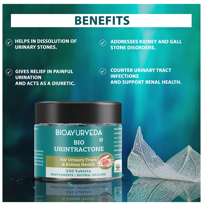 Bioayurveda Bio Urintractone Tablet Bioayurveda Bio Urintractone Tablet is made from a combination of herbs with diuretic and antibacterial properties. These properties help treat kidney and urinary tract infections (UTI) and other urinary problems like reduced urine formation, burning sensation, or discomfort while urinating. It helps maintain the kidneys in optimal health. It is instrumental in the prevention and management of kidney stones.