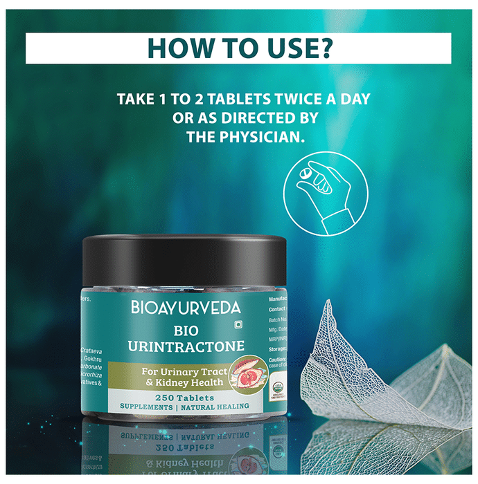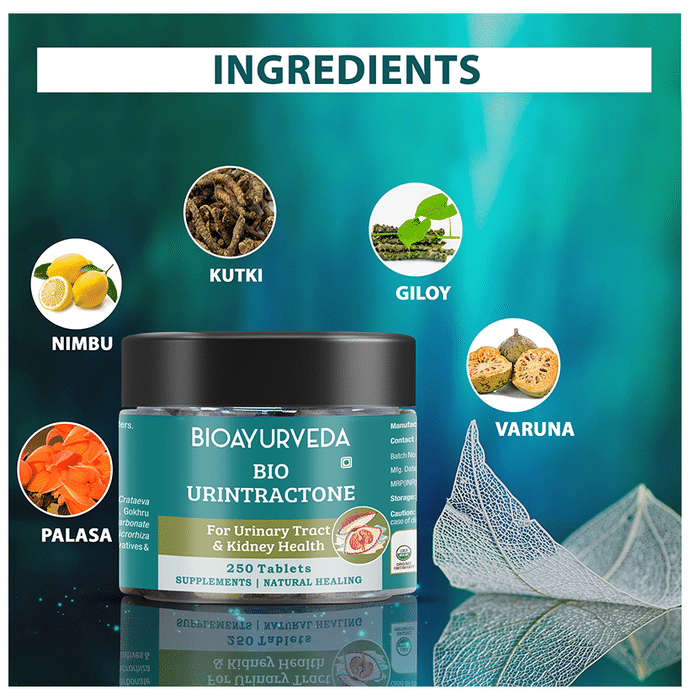 Bioayurveda Bio Urintractone Tablet is made from a combination of herbs with diuretic and antibacterial properties. These properties help treat kidney and urinary tract infections (UTI) and other urinary problems like reduced urine formation, burning sensation, or discomfort while urinating. It helps maintain the kidneys in optimal health. It is instrumental in the prevention and management of kidney stones. | Key Ingredients: Nimbu Kutki Giloy Varuna Palasa | Key Benefits: It helps maintain the kidneys in optimal health It is instrumental in the prevention and management of kidney stones It is helpful in diseases like kidney stones, urinary tract infection, difficulty in micturition, gout and osteoarthritis It has anti-microbial and antibacterial properties that prevent urinary infections It reduces the risk of kidney stones due to its mutral (diuretic) property which increases the urine output and helps flush the toxins from the urinary tract and kidneys It is used in diseases like kidney stones, urinary tract infection, difficulty in micturition, gout and osteoarthritis It has the potential to upset the stomach and enlarge the size of the prostate in men This may help you with calming down your mind and promote restful sleep | Directions For Use: Read the label carefully before use | Safety Information: Read the label carefully before use Store in a cool and dry place away from direct sunlight Keep out of reach of children