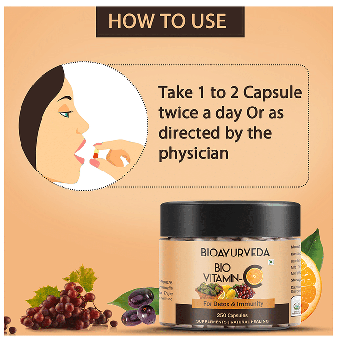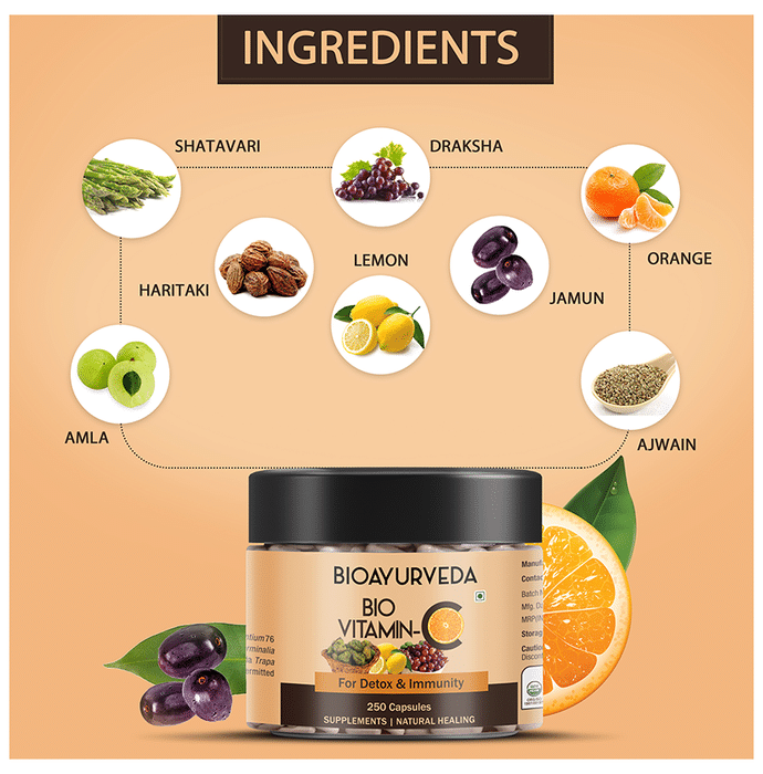 Bioayurveda Bio Vitamin-C Tablet is a supplement for people in need of vitamin C. It helps in boosting immunity and metabolism in the body. It may reduce uric acid levels in the blood and prevent pain caused by gout attacks. It can aid in reducing the risk of chronic heart diseases. Vitamin C enhances the iron absorption capacity from the diet, reduces the risk of iron deficiency in the body and hence protects the immune system. | Key Ingredients: Shatavari Amla Haritaki Lemon Draksha Jamun Orange Ajwain | Key Benefits: Vitamin C capsules are beneficial in enhancing the immune system of the body It may help in maintaining the radiance and texture of the skin It contains antioxidants that protect the body against free radicals It also reduces the risk of cardiac diseases and maintains high blood pressure This capsule can support the general health and well-being of men This herbal formulation can help the body recover from intense activity and infections It is rich in antioxidants that can help the body to fight the free radicals in the body This product can improve the immunity that helps the body fight against the various diseases This capsule can help in maintaining skin health and makes them soft and supple | Directions For Use: Use as directed on the label or as advised by your healthcare provider. | Safety Information: Read the label carefully before use Store in a cool and dry place away from direct sunlight Keep out of reach of children