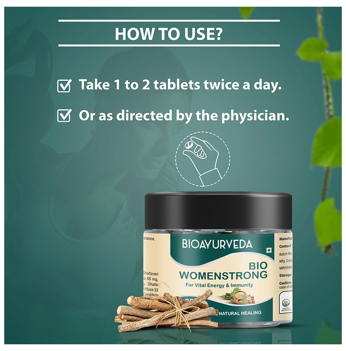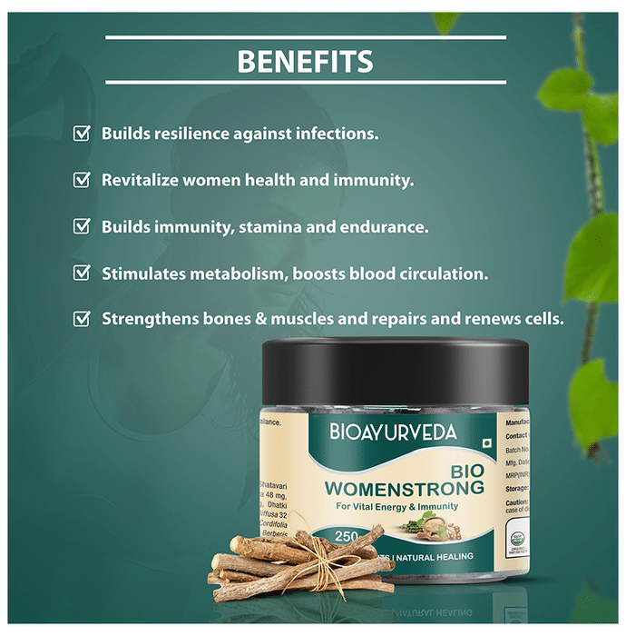 Bioayurveda Bio Womenstrong Tablet Bioayurveda Bio Womenstrong Tablet contains essential nutrients packed with vitamins and minerals that help produce energy, stamina, vitality and mental performance. The multivitamin capsules support the brain, skin, hair, nails and overall health of the body and enhance immunity.