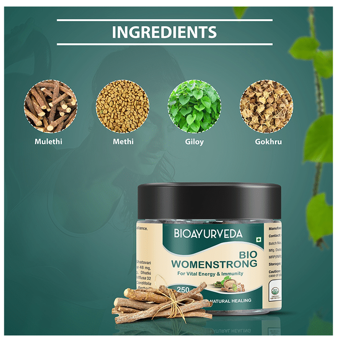 Bioayurveda Bio Womenstrong Tablet contains essential nutrients packed with vitamins and minerals that help produce energy, stamina, vitality and mental performance. The multivitamin capsules support the brain, skin, hair, nails and overall health of the body and enhance immunity. | Key Ingredients: Mulethi Methi Giloy Gokhru | Key Benefits: It has vitamins, minerals, herbs and antioxidants that can help support skin, hair, nails, brain and overall development of the body It promotes immunity and energy production It is formulated for women to help fulfil nutritional needs and support general well-being It improves immunity and enhances female vitality It is the perfect mix of natural ingredients and rare herbs well-known for maintaining hormonal balance, controlling menstrual pain and supporting vitality These capsules help immune function and also regulate mood and reduce depression This capsule increases bone strength and combats regular fatigue | Directions For Use: Use as directed on the label or as advised by your healthcare provider | Safety Information: Read the label carefully before use Store in a cool and dry place away from direct sunlight Keep out of reach of children