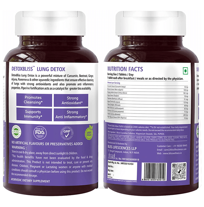 Bliss Welness Lung Detox Veg Tablet Bliss Welness Lung Detox Veg Tablet It is a dietary supplement formulated with curcumin, vasaka, stinging nettle, beetroot, ginger and arjuna to support your lung health. Its antioxidant and anti-inflammatory properties promote lung rejuvenation and improve immunity. It also helps to cleanse the lungs and flush out toxins from it.