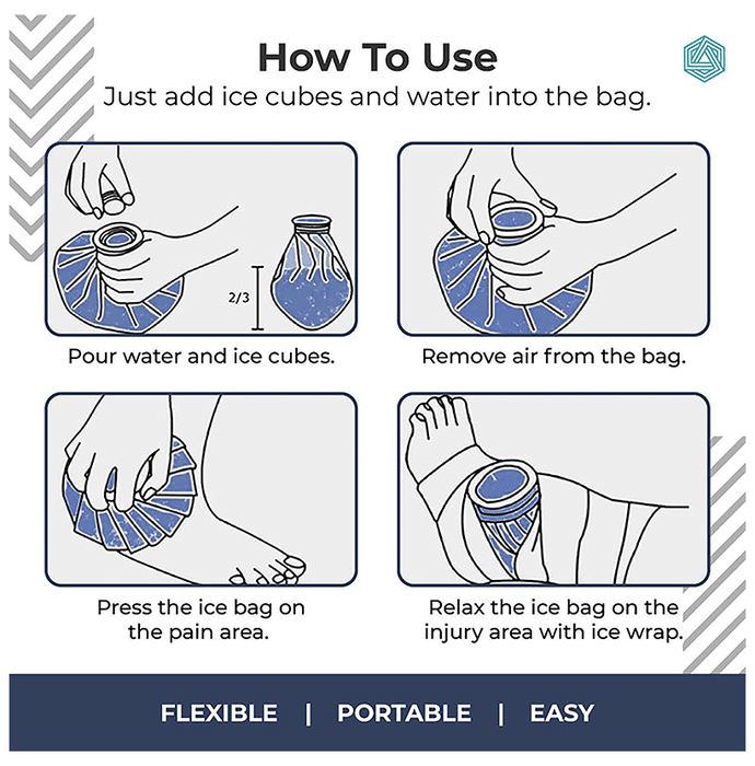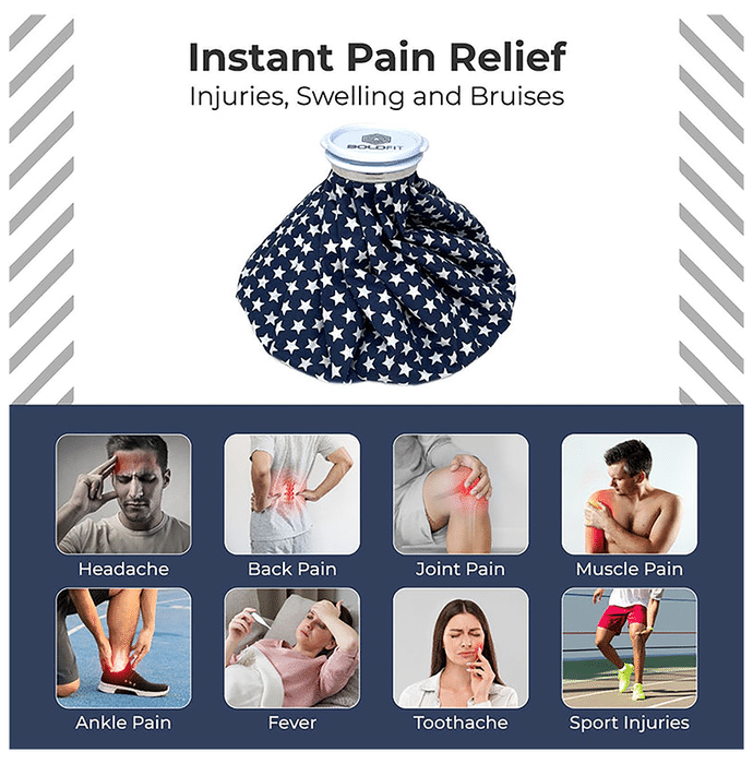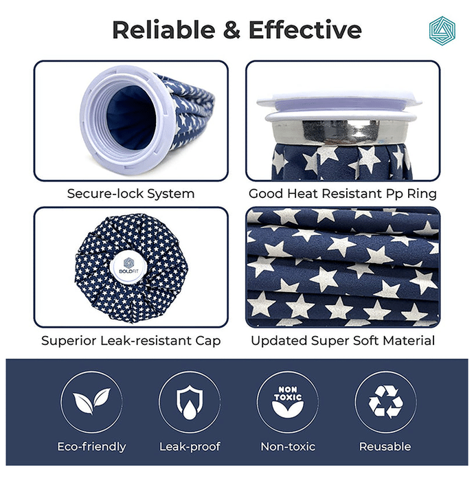 Boldfit Ice Bags For Pain Relief 12inch Blue Star It is a pain relief ice bag that can help manage body aches and swellings. This bag is designed with a large-cap to put solid or smashed ice into the bag for a cold compress. It's convenient, flexible, soft, and soft-touch rubberised fabric. It is suitable for cold therapy to help reduce slight scratches, bruises, muscle pain, sprays and strains, and swelling. | Uses It is used to treat sore muscles and other knee or joint pains. | Product Features and Specifications It is suitable for cold therapy to help reduce slight scratches, bruises, muscle pain, sprays and strains, and swelling It can help relieve pain, reduce swelling, and speed recovery This attractive ice-cool pack is a waterproof rubberised fabric with a plastic screw cap to securely keep the cold and wet inside the bag The cold pack for pain relief comprises heavy-duty material; they travel well and are refillable and reusable The ice pain relief bag has a large-cap, which is easy to fill the ice or smash ice It can help soothe the stomach, sinus, and joint pain. Convenient, flexible, and soft, and can be used anywhere Its soft fabric can help provide comfort and coverage to the injured areas It stays cold much longer than traditional gel packs, ice packs, or other cold packs The Superior Leak-proof Cap with a large opening is for easy filling of ice cubes or crushed ice | Directions For Use Pour water and ice cubes. Remove air from the bag. Press the ice bag on the pain area. Relax the ice bag on the injury area with an ice wrap. | Safety Information Read the label carefully before use Store in a cool and dry place away from direct sunlight Keep out of reach of children