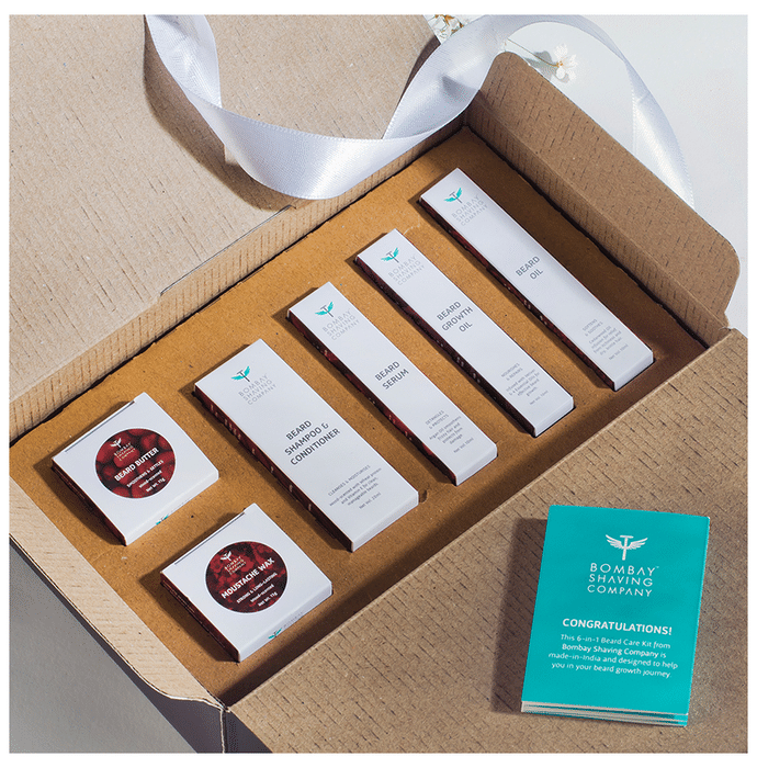 Bombay Shaving Company Beard Care Valentine's Day Gift Kit is perfect for a man who likes to keep his beard well-nourished, groomed and styled. This Valentine’s day give your man the gift of the best grooming experience ever. This exquisite Beard Care Starter Kit from Bombay Shaving Company is thoughtfully curated using selected products that will give your man the bold beard he always dreamt about. | Key Ingredients of Beard shampoo and conditioner: Vitamin E Wheat Protein Key Ingredients of Cedarwood Beard Oil Argan oil Macadamia oil Thyme oil Key Ingredients of Beard Growth Oil Onion oil Rosemary Key Ingredients of Beard Softener Coconut and olive oil Shea Butter Key Ingredients of Moustache Wax Fenugreek Flaxseed Extract | Key Benefits: Nourishes and strengthens the hair follicles to promote thick hair and prevent hair fall It contains vitamin E that helps to build tissue and promotes hair growth It helps to brighten skin and restore the youthful glow | Directions For Use: Use as directed on the label. | Safety Information: Read the label carefully before use Do not exceed the recommended dosage Store in a cool and dry place away from direct sunlight Keep out of reach of children Use under medical supervision