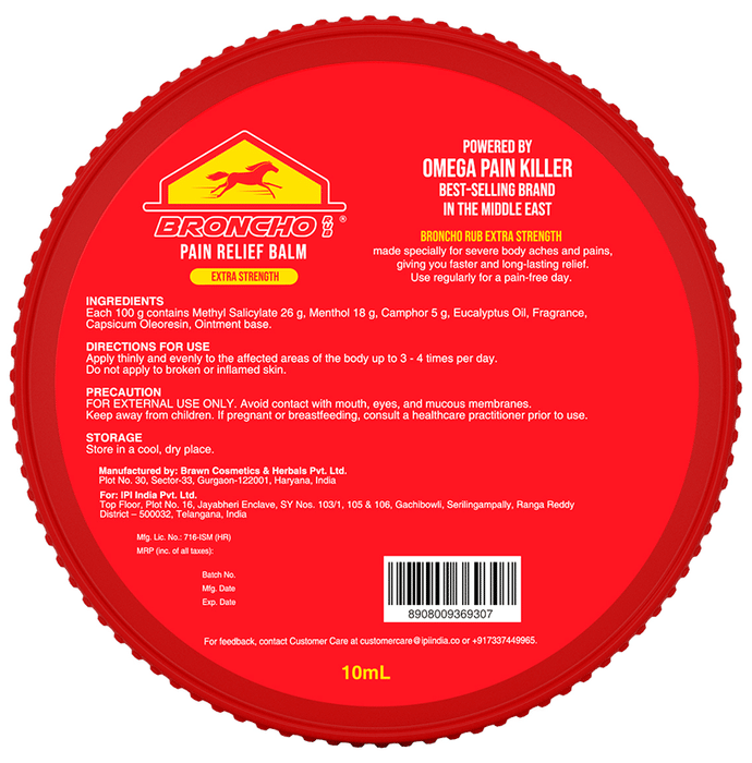 Broncho Rub Pain Relief Balm Extra Strength Broncho Rub Pain Relief Balm Extra Strength is a pain relief balm made especially for severe body aches and pains. It provides faster and long-lasting relief from pains and aches. It can be used regularly for a pain-free lifestyle.