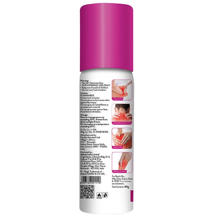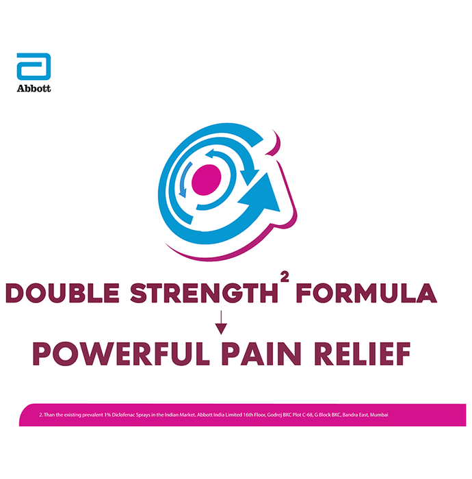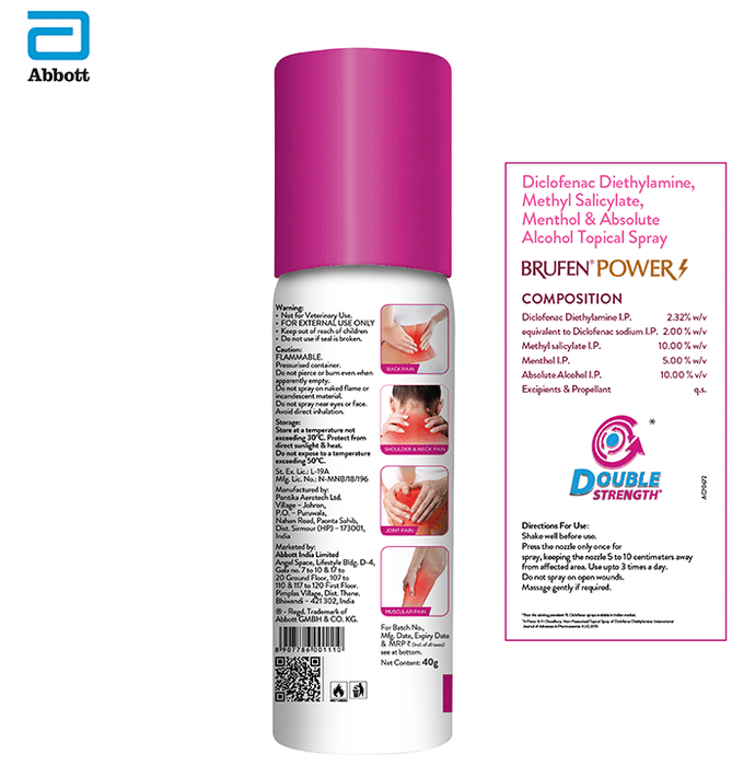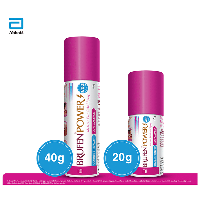 Brufen Power Metered Pain Relief Spray is a metered pain relief spray with double strength* of Diclofenac for powerful pain relief and a precision nozzle with 1 shot technology that allows only a limited amount of product to be released thus ensuring low wastage. Provides effective relief from back pain, joint pain, muscle pain, shoulder and neck pain. Available in value for money packs - 40g (800 sprays) and 20g (400 sprays). | Key Ingredients: Diclofenac diethylamine I.P - 2.32%w/v Equivalent to Diclofenac sodium I.P. 2% w/v Methyl salicylate I.P 10% w/v Menthol I.P 5% w/v | Key Benefits: Diclofenac Diethylamine I.P 2.32% provides powerful pain relief Methyl Salicylate I.P 10% helps to relieve discomfort and pain by its counter-irritant action Menthol I.P 5% helps to relieve pain by its cooling effect Provides powerful pain relief with double strength* of Diclofenac It has a metered spray to ensure low wastage+ Provides targeted pain relief with its precision nozzle with 1 shot technology Provides effective relief from backache, joint pain, muscle, shoulder, neck pain and total ortho care | Directions For Use: Shake well before use. Press nozzle only once for spray, keeping the nozzle 5 to 10cm away from the affected area Do not spray on open wounds. Use up to 3 times a day | Safety | Information: Read the label carefully before use Store at room temperature away from direct heat Do not expose to temperature exceeding 50 C Do not freeze Keep out of reach of children Diclofenac as a molecule is a schedule H but since this is a topical/external use product it does not require a Schedule H warning *Than the existing prevalent 1% Diclofenac sprays available in the Indian market +N Pawar & H Chaudhary. Non-Pressurized Topical Spray of Diclofenac Diethylamine. International Journal of Advances in Pharmaceutics 4(4) 2015 Brufen Power Spray PI. Abbott India Limited. Data on File. Abbott India Limited. Pawar N, et al. International Journal of Advances in Pharmaceutics. 2015;4(4):40-48. Yano T, et al. J Pharmacobiodyn.1991;14(12):663-9.
