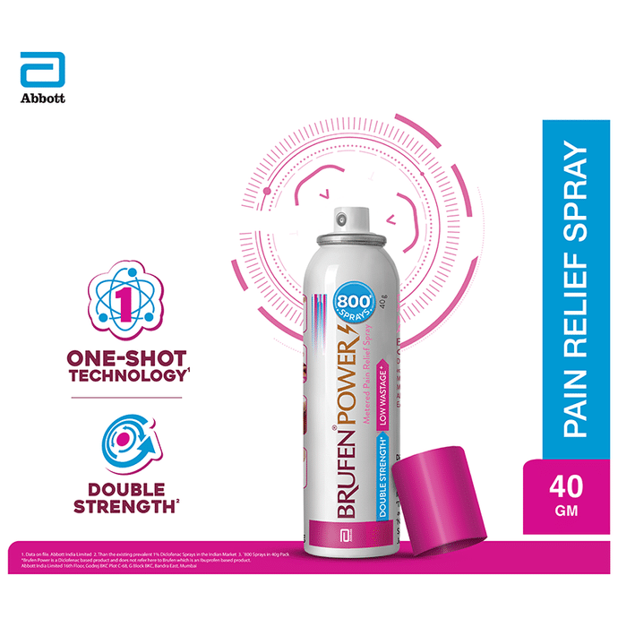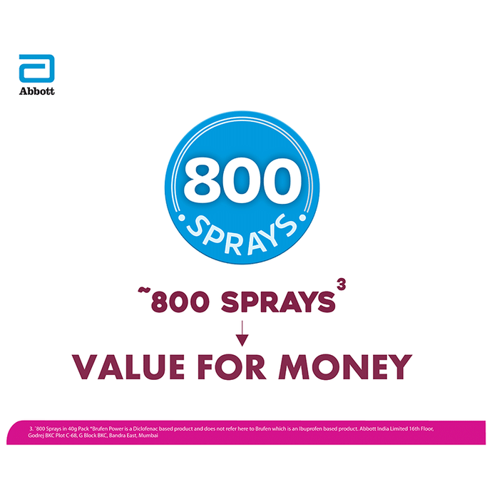 Brufen Power Pain Relief 800 Sprays Brufen Power Metered Pain Relief Spray is a metered pain relief spray with double strength* of Diclofenac for powerful pain relief and a precision nozzle with 1 shot technology that allows only a limited amount of product to be released thus ensuring low wastage. Provides effective relief from back pain, joint pain, muscle pain, shoulder and neck pain. Available in value for money packs - 40g (800 sprays) and 20g (400 sprays). Key Ingredients: Diclofenac diethylamine I.P - 2.32%w/v Equivalent to Diclofenac sodium I.P. 2% w/v Methyl salicylate I.P 10% w/v Menthol I.P 5% w/v