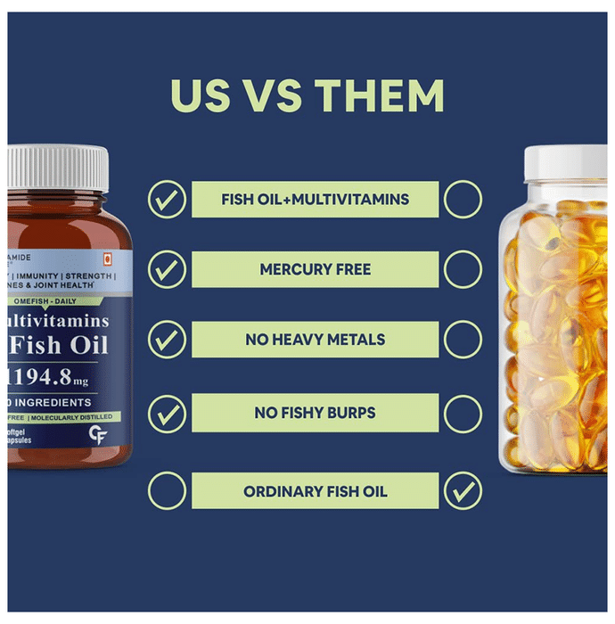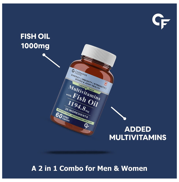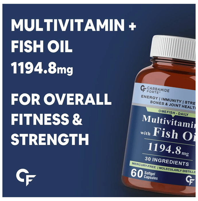 Carbamide Forte Multivitamins with Fish Oil Softgel Capsule Carbamide Forte Multivitamins with Fish Oil Softgel Capsule is a rich natural source of omega-3 that includes the nutrients EPA and DHA. It helps to maintain the growth, vision and tissue development. It contains essential fats including EPA (Eicosapentaenoic Acid) and DHA (Docosahexaenoic Acid). They have been shown to support overall wellness, including heart, brain, joint, and eye health. Research has shown Omega-3 products to support healthy glucose levels and healthy lipid levels in professional athletes.