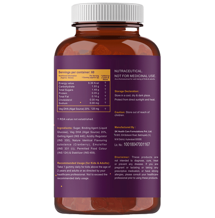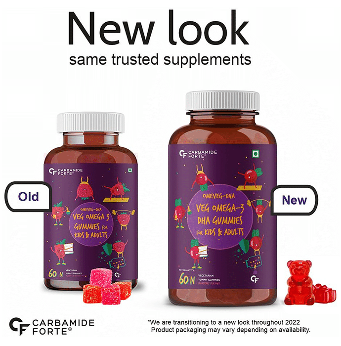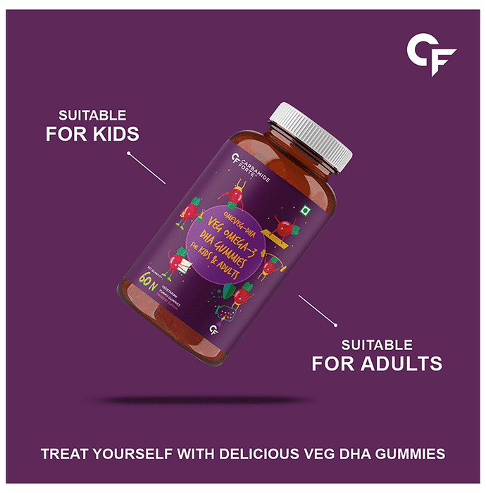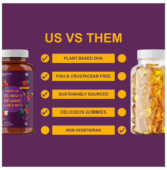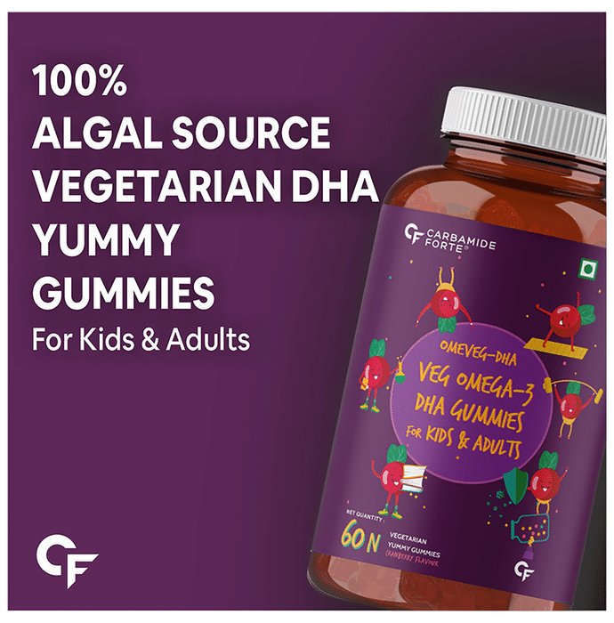 Carbamide Forte Omega 3 Vegetarian Yummy Gummies contains omega 3 polyunsaturated fatty acids. Omega-3 polyunsaturated fatty acids are found in oils from certain types of fish, vegetables, and other plant sources but this is a vegetarian product so vegan omega 3 comes from marine algae without killing any fish. These fatty acids are not made by the body and must be consumed in the diet. These work by lowering the body’s protection of triglycerides. High levels of triglycerides can lead to coronary artery disease, heart disease, and stroke. | Key Ingredients: Sucrose Liquid glucose Pectin Agar Veg DHA (algal source) | Key Benefits: Unlike other fish oil omega 3 capsules, this vegan omega 3 comes from marine algae without killing any fish. It is the most bioavailable DHA for max absorption Did you know that neither fish nor krill produces omega-3s? This product is obtained by consuming nutrient-rich algae. So skip the fish oil capsule or fish oil tablet and get your omega 3 veg straight from the source Most vegetarian omega 3 capsules for women and men, veg DHA supplements use fish oils which often contain toxins such as mercury and dioxin. This ultra-concentrated algae omega 3 formula is derived from algae and is free of heavy metals and toxins The plant-based vegetarian omega 3 for men and women is burp-less, fish-free capsules. Fish burps are happily a thing of the past. It is more environmentally friendly and sustainable than omega 3 fish oil capsules for women and men Vegetarian omega 3 supplements (DHA) help to increase calcium in your bones while reducing chronic joint pain and tenderness by counteracting inflammation. Optimal brain and heart function relies on increased levels of DHA | Directions For Use: For 2-4 year old kids, consume one gummy daily Kids above the age of 4 and adults, consume two gummies daily, or as directed by your healthcare professional | Safety Information: Read the label carefully before use Do not exceed the recommended dosage Store in a cool, dry and dark place Protect from direct sunlight and heat Keep away from the reach of children