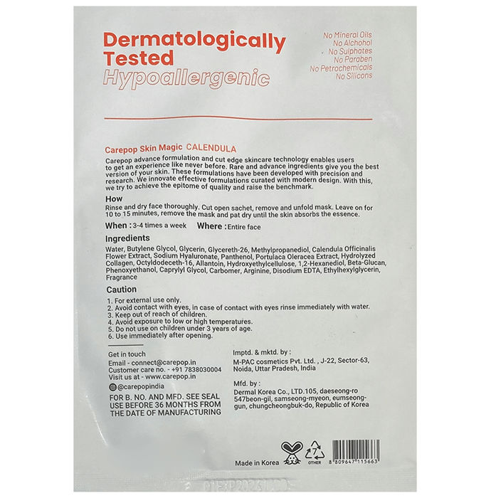 Carepop Spotless Series Prime Collagen Sheet Mask is a dermatologically tested hypoallergenic sheet mask. The mask is suitable for all skin types and is ideal for both men and women. | Key Ingredients: Butylene glycol Aloe barbadensis leaf juice Hydrolysed collagen Portulaca oleracea extract Beta-glucan Phenoxyethanol | Key Benefits: The presence of calendula can help in reducing stretch marks & C-section marks The mask contains no mineral oil, alcohol, sulphates, paraben, petrochemicals, and silicons This sheet mask is formulated with the advanced formulation and cut-edge skincare technology, which can help in maintaining healthy skin | Directions For Use: Use 3-4 times a week on the entire face Rinse and dry face thoroughly Cut open sachet, remove and unfold mask Leave on for 10 to 15 minutes, remove the mask and pat dry until the skin absorbs the essence | Safety Information: Do not use it on children under three years of age For external use only Keep out of reach of children Use immediately after opening Avoid exposure to low or high temperature Avoid contact with eyes; in case of contact with eyes, rinse immediately with water