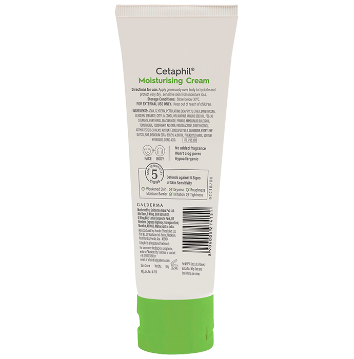 Cetaphil Moisturising Cream Dry to Normal, Sensitive Skin is a potent blend of emollients and humectants that can help provide intense moisture. It can aid in binding water to the skin and keep it hydrated. The cream can help manage dry and sensitive skin and protect it from arid skin conditions. It has a non-greasy texture, and its soothing composition is beneficial for nourishing your skin. Key Ingredients: Glycerin Petrolatum Dicaprylyl ether Dimethicone Glyceryl stearate Sweet almond oil Tocopheryl acetate Acrylates Dimethiconol Glyceryl acrylate Propylene glycol Disodium EDTA Sodium hydroxide | Key Benefits: It can primarily aid in providing intense moisture and dealing with dry skin conditions A clinically proven cream aids in soothing irritated skin, and it is allergen-free Its unique composition hydrates the skin without clogging the pores Non-greasy and fragrance-free cream aids in improving the skin texture | Directions for Use: Apply an adequate amount of the cream all over the body and face or just over the affected area | Safety Information: Read the label carefully before use Keep out of the reach of children Store in a cool, dry place away from direct sunlight and heat