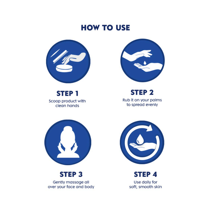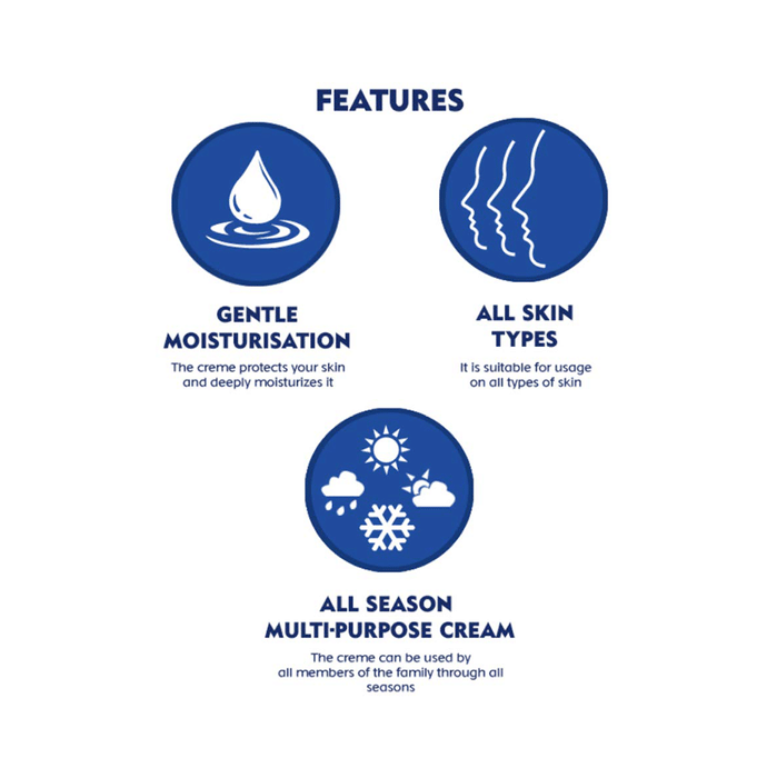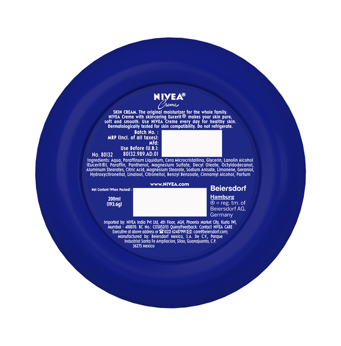 Read the label carefully before use | Store in a cool dry place away from direct sunlight | Keep out of reach of the children | Avoid physical damage Nivea Multi-Purpose Creme (Beiersdorf AG) Nivea Creme pamper your skin with the formula which not only cares but also protects your skin leaving it healthy and moisturized. It’s an all-purpose creme that you can use for everyone in the family, making it the perfect moisturizer for all seasons. Key Ingredients: Lanolin Alcohol | Paraffin | Panthenol | Magnesium Sulfate | Decyl Oleate | Octyldodecanol | Aluminum Stearates | Citric Acid | Magnesium Stearate | Limonene | Geraniol | Hydroxycitronellal | Linalool | Citronellol | Benzyl Benzoate | Cinnamyl Alcohol | Parfum Key Benefits: It repairs, nourishes, smoothens dry and mature skin | It is specifically designed to meet the needs of mature dry skin, it repairs and nourishes the skin deep down | It is used to stimulate epidermal renewal and enhance the skin's elasticity, boosting complete, balanced moisturisation | It helps make the skin soft, smooth and supple | This cream is recommended for the prevention of stretch marks Directions For Use: Scoop product with clean hands | Rub it on your palms to spread evenly | Gently massage all over your face and body | Use daily for soft, smooth skin Safety Information: Read the label carefully before use | Do not exceed the recommended dose | Keep out of the reach of children | Store in a cool and dry place | Should be protected from sunlight