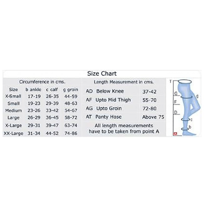 Comprezon Cotton Varicose Vein Stockings Class 2 Above Knee is used as a physical aid, especially designed for women suffering from varicose veins. It meets international specifications for varicose vein stockings and is highly economical. | Uses: It is primarily used to assist patients suffering from varicose veins and prevents pooling of blood. | Product Specifications & Features: | Prevents blood pooling: Applies graduated compression or high pressure at the ankle, medium pressure at the thigh which allows blood to flow back up to the leg | Quality Assurance: It is the only brand manufactured in India which meets international specifications for varicose vein stockings | Economical Price: It is an economical alternative to imported brands and is exported to more than 40 countries | High Quality Design: Manufactured using German Machinery and imported raw materials to provide accurate pressure for each indication of varicose veins | Toe Style: Peep hole | Material Content: 65% Polyamide, 35% Elastane | Ankle circumference in cm: Small- 19-23 Medium- 23-26 Large- 26-29 XLarge-29-31 XXLarge- 31-34 | Directions For Use: Read the instruction manual to use Comprezon Cotton Varicose Vein Stockings Class 2 Above Knee. | Safety Information: Read the user manual carefully before use Keep out of the reach of children