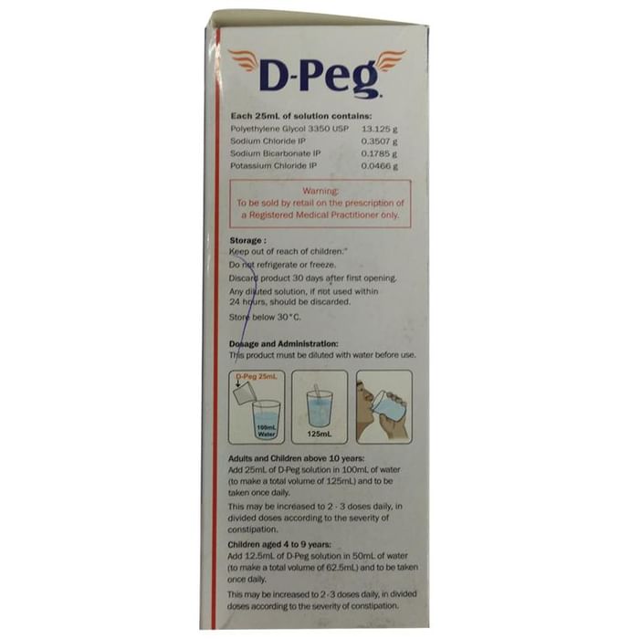 D-Peg Oral Solution D Peg Solution contains Polyethylene glycol, Potassium chloride, Sodium bicarbonate, Sodium chloride, and Sodium picosulphate as major ingredients. Key benefits/uses of D Peg Solution: Role of active ingredients: -Polyethylene glycol: Used to treat constipation.It works by causing water to be retained with the stool. This increases the number of bowel movements and softens the stool and easy to evacuate -Potassium chloride: Used to prevent or to treat low blood levels of potassium -Sodium bicarbonate: Used to relieve heartburn, sour stomach, or acid indigestion by neutralizing excess stomach acid. It may be used to treat the symptoms of stomach or duodenal ulcers -Sodium chloride: Electrolyte that controls the quantity of water in your body. It plays an important role in the transmission of nerve impulses and muscle contractions. It is used to treat or prevent sodium loss caused by dehydration, excessive sweating, or other causes -Sodium picosulphate: Used to relieve constipation difficulty with bowel movements. It is a stimulant laxative, which induces a laxative effect Directions for use/Dosage: - As directed by the physician Safety information: - Do not exceed the recommended dose - Read the label carefully before use - Keep out of the reach and sight of children