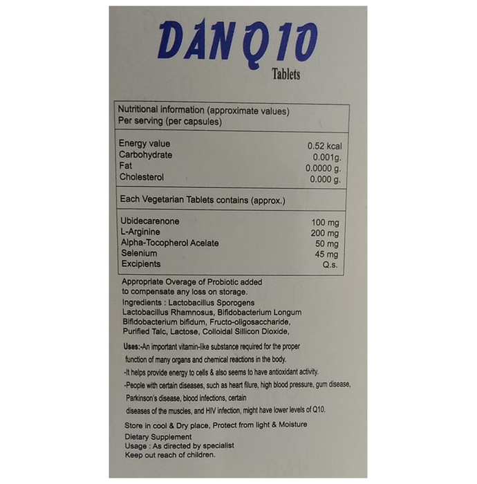 Dan Q10 Tablet is beneficial for taking care your your cardivasulaor function. It may act as a heart tonic and ensure its healthy working. It also contains eleemnts that help to improve the immunity of the body to protect you against various viruses. This tablet helps to promote an overall healthy body. | Key Ingredients: Ubidecarenone L-Arginine Alpha tocopherol acelate Selenium | Key Benefits: It helps to promote healthy heart health It helps in the proper vascular function It strengthens the immunity system to fight against various viruses It promotes overall healthy health | Directions For Use: Use as directed by the healthcare professional. | Safety Information: Read the label carefully before use Store in a cool and dry place, away from sunlight Keep out of reach of children Do not exceed recommended dosage