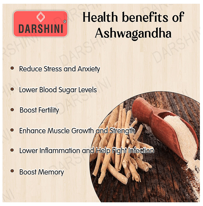 Darshini Ashwagandha Withania Somnifera Powder is an evergreen shrub that grows in India. The herb is considered one of the most important herbs in the ayurvedic medicine system. Ashwagandha promotes physical fitness, relieves stress, and supports brain function. It improves immunity and is anti-inflammatory which helps to reduce pain and joint aches, improves fertility in both men and women, fights against fungal, bacterial viral infections and supports heart health. | Key Ingredients: Ashwagandha powder | Key Benefits: It helps the body to respond and adapt to the physical and mental stress that plagues our busy lifestyles Ashwagandha is a powerful adaptogen that soothes the nervous system, providing a quick, safe and natural way to relieve stress, anxiety and insomnia Ashwagandha is an antioxidant that eliminates free radicals, thereby reducing inflammation, soothing the pain and joint aches It improves immunity and is anti-inflammatory which helps to reduce pain and joint aches Ashwagandha inhibit most of the phytopathogenic fungi and bacteria | Directions For Use: Read the label carefully before use. | Safety Information: Read the label carefully before use Store in a cool and dry place away from direct sunlight Keep out of reach of children