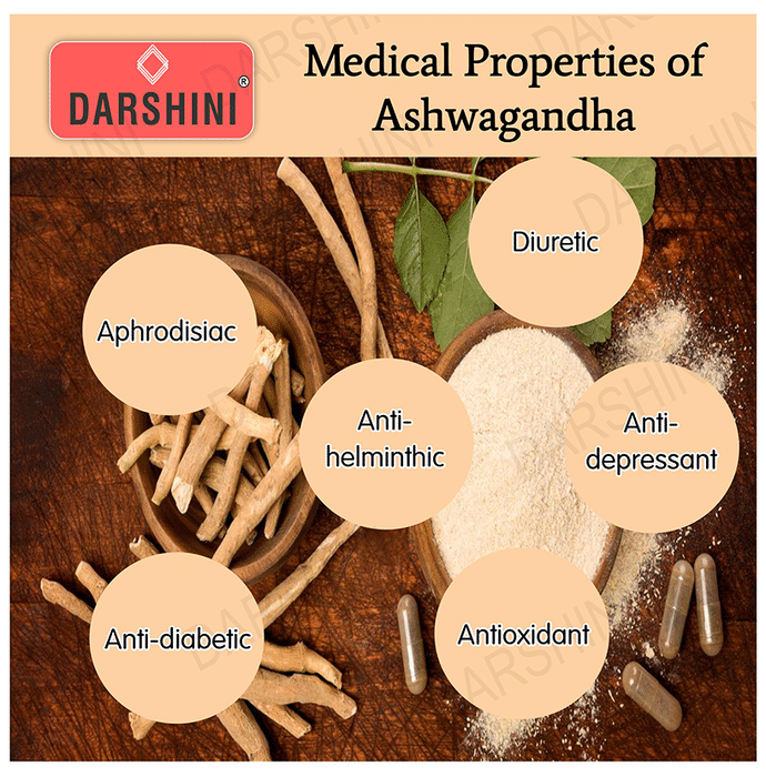 Darshini Ashwagandha Withania Somnifera Powder Darshini Ashwagandha Withania Somnifera Powder is an evergreen shrub that grows in India. The herb is considered one of the most important herbs in the ayurvedic medicine system. Ashwagandha promotes physical fitness, relieves stress, and supports brain function. It improves immunity and is anti-inflammatory which helps to reduce pain and joint aches, improves fertility in both men and women, fights against fungal, bacterial viral infections and supports heart health.