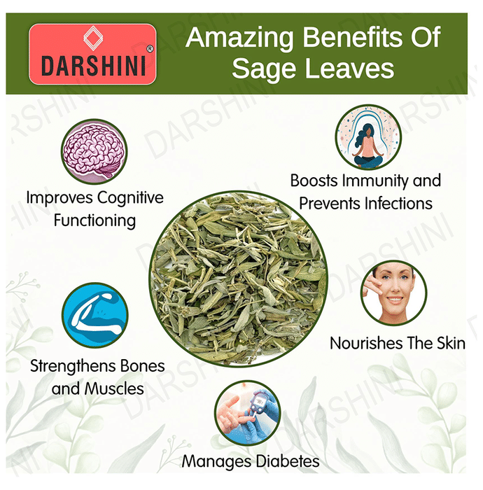Darshini Sage Leaf / Garden Sage Leaves contains organic sage leaves that are dried and packed. Sage offers the best flavour to bean, tomato sauces and pasta dishes and is often paired with other herbs like rosemary, thyme and oregano to bring out the earthy and aromatic flavour. | Key Ingredients: Sage leaves | Key Benefits: Sage also contains small amounts of magnesium, zinc, copper and vitamins A, C and E It contains over 160 distinct polyphenols, which are plant-based chemical compounds that act as antioxidants in your body It is loaded with antioxidants that are linked to several health benefits, including improved brain function and lower cancer risk It has antimicrobial properties that may kill microbes that encourage the growth of dental plaque It may help reduce the intensity and frequency of menopause symptoms, such as hot flashes and irritability Sage may lower blood sugar levels by increasing insulin sensitivity, more human research is needed | Directions For Use: Read the label carefully before use. | Safety Information: Read the label carefully before use Store in a cool and dry place away from direct sunlight Keep out of reach of children